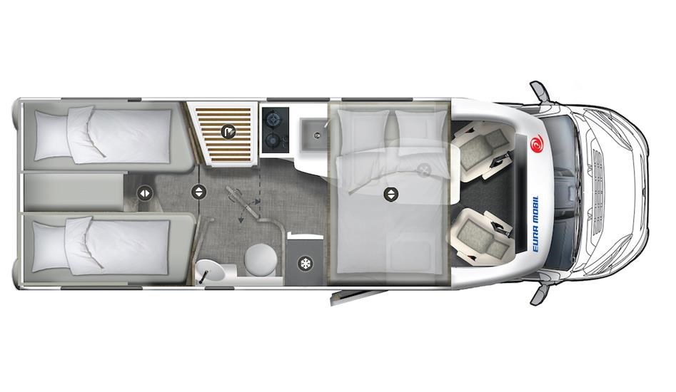 Beds: Rear twin beds (2x 2030 x 840 mm), drop-down bed (1930 x 1400 mm)