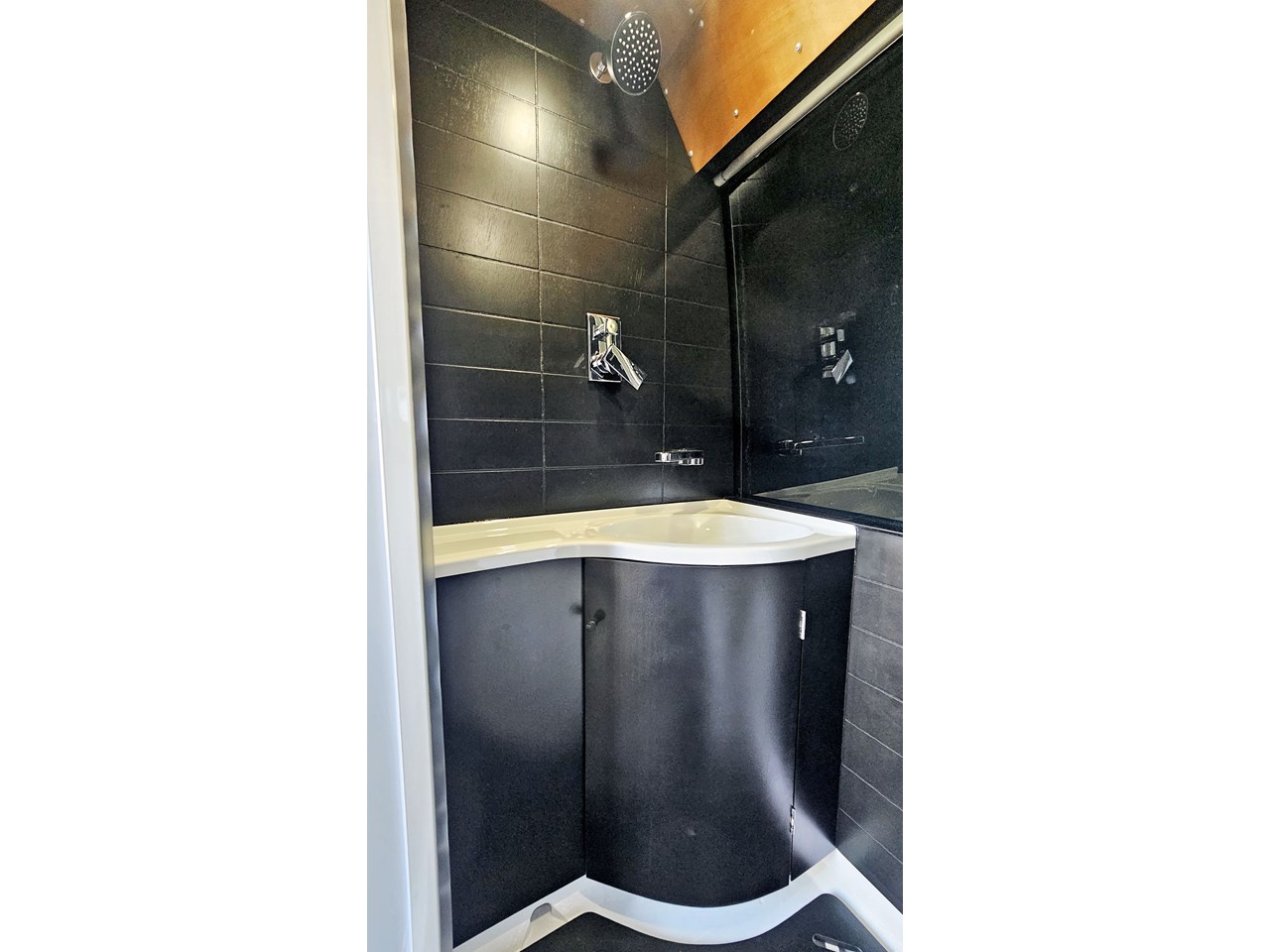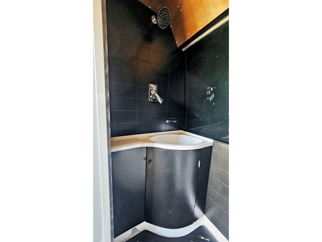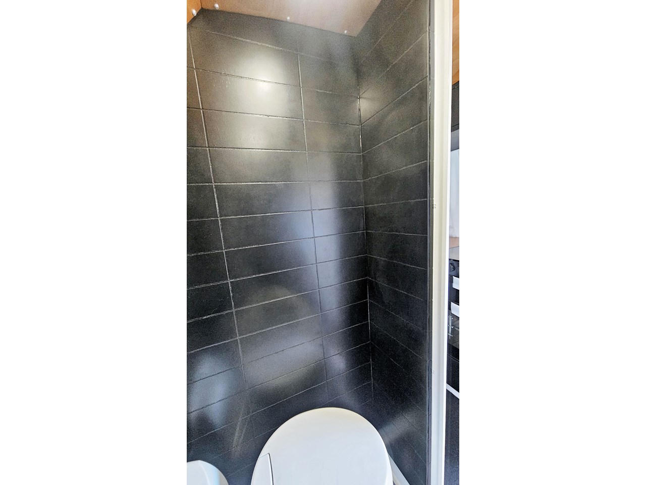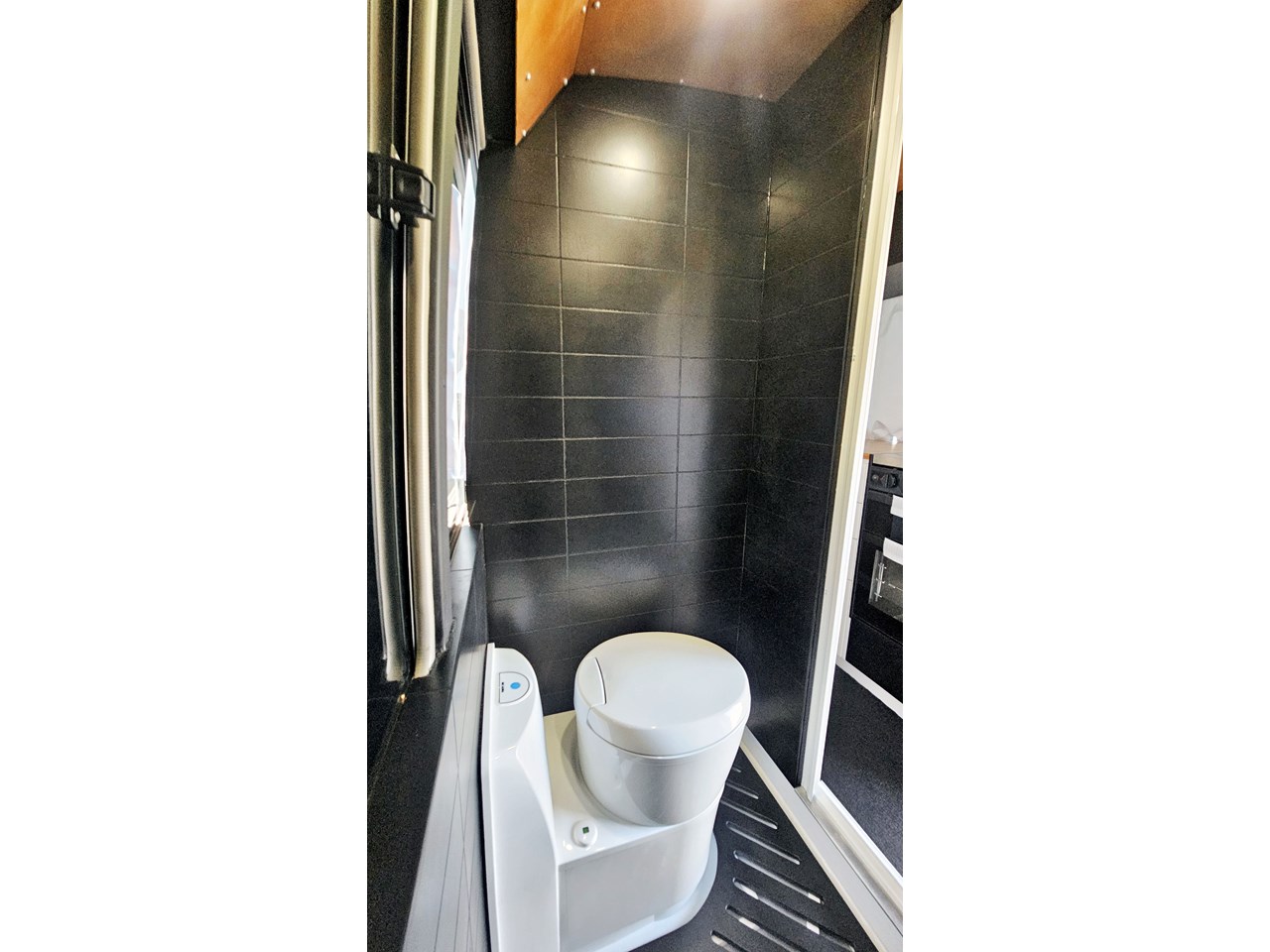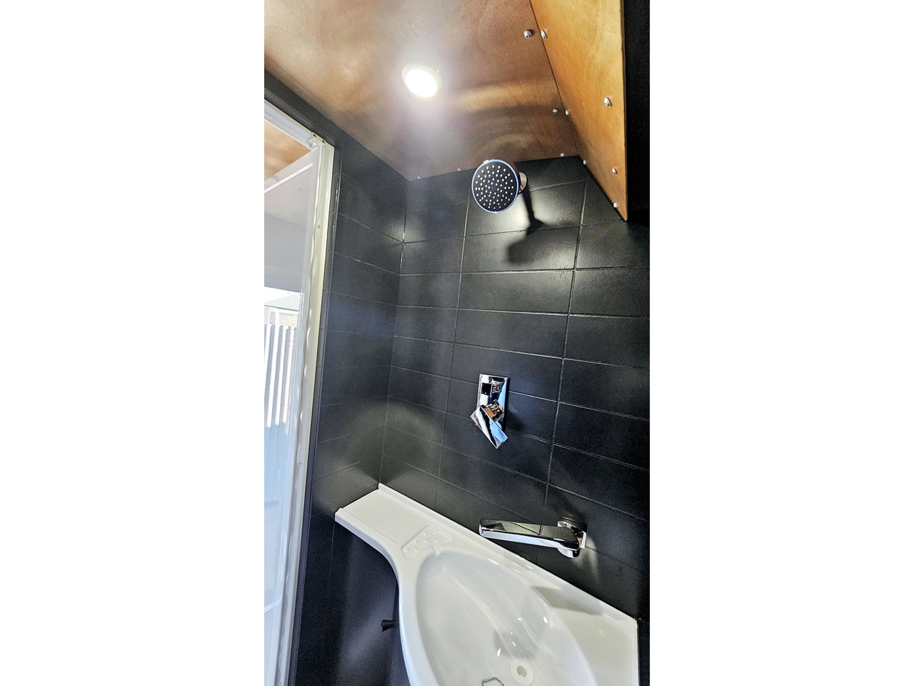 The wetroom is another work of art; all surfaces are sealed with 3 coats of epoxy sealer, then tanked with 3 coats of marine epoxy. The base is then coated with another 3 coats of epoxy brushing polyurethane, making the room completely waterproof and aesthetically stunning. All before the 4mm okoume ply tile board is cut and grooved, coated with 3 coats of shellac-based sealer on both sides, 3 coats of automotive lacquer, then finally fixed and sealed at all joins.