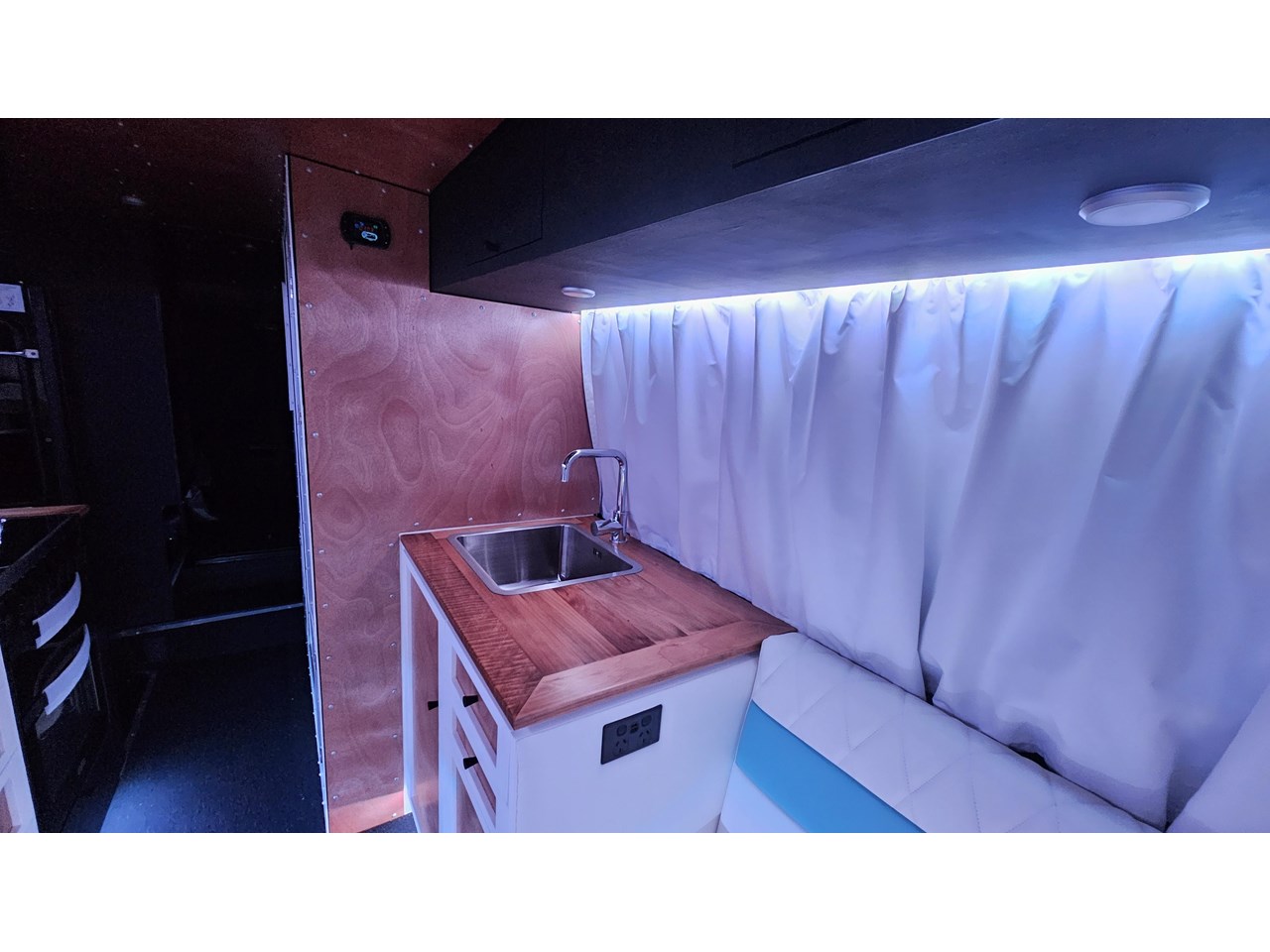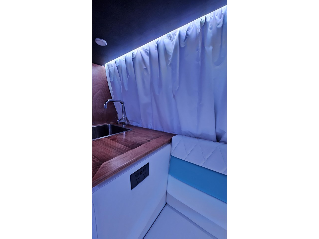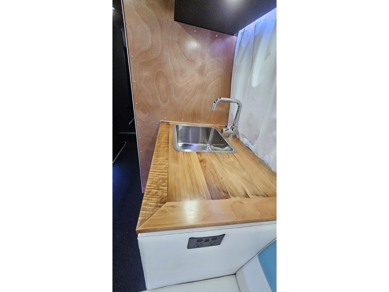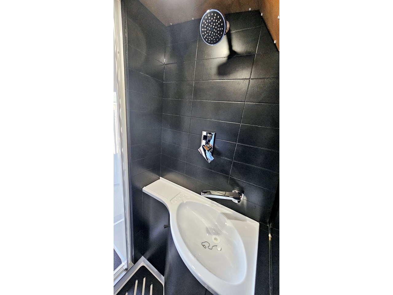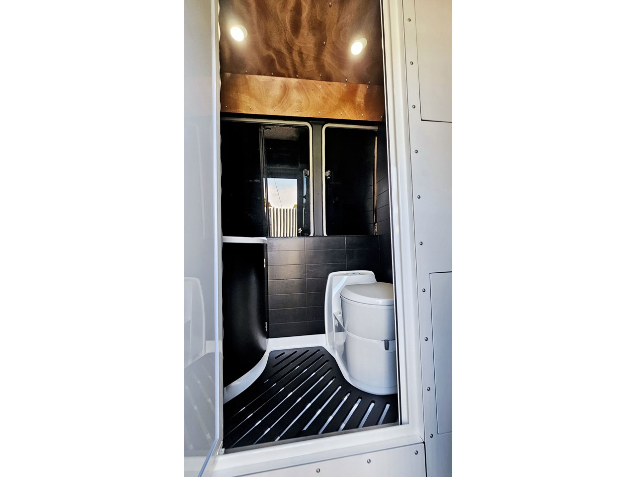 The wetroom is another work of art; all surfaces are sealed with 3 coats of epoxy sealer, then tanked with 3 coats of marine epoxy. The base is then coated with another 3 coats of epoxy brushing polyurethane, making the room completely waterproof and aesthetically stunning. All before the 4mm okoume ply tile board is cut and grooved, coated with 3 coats of shellac-based sealer on both sides, 3 coats of automotive lacquer, then finally fixed and sealed at all joins.