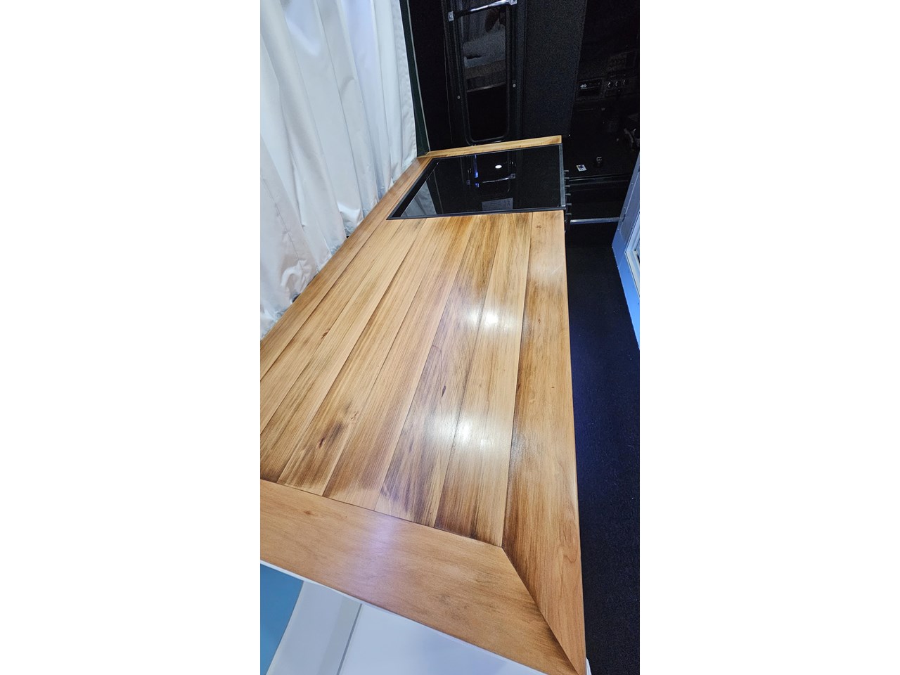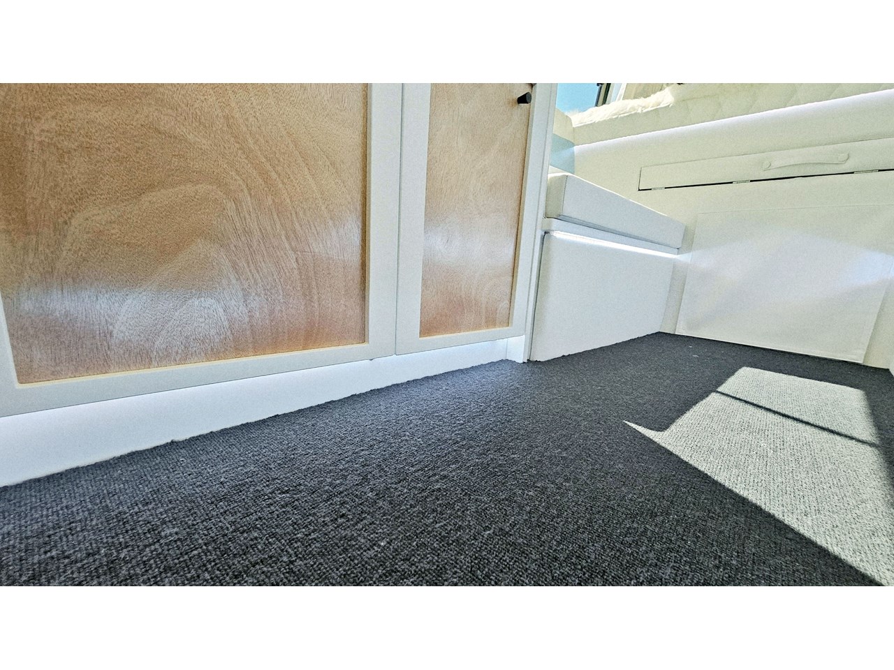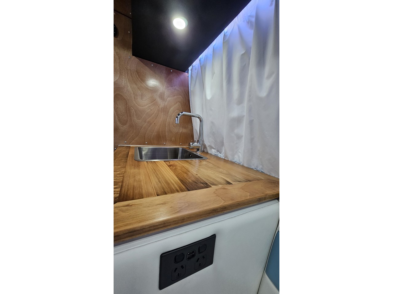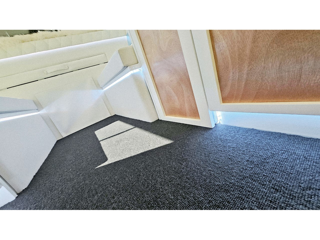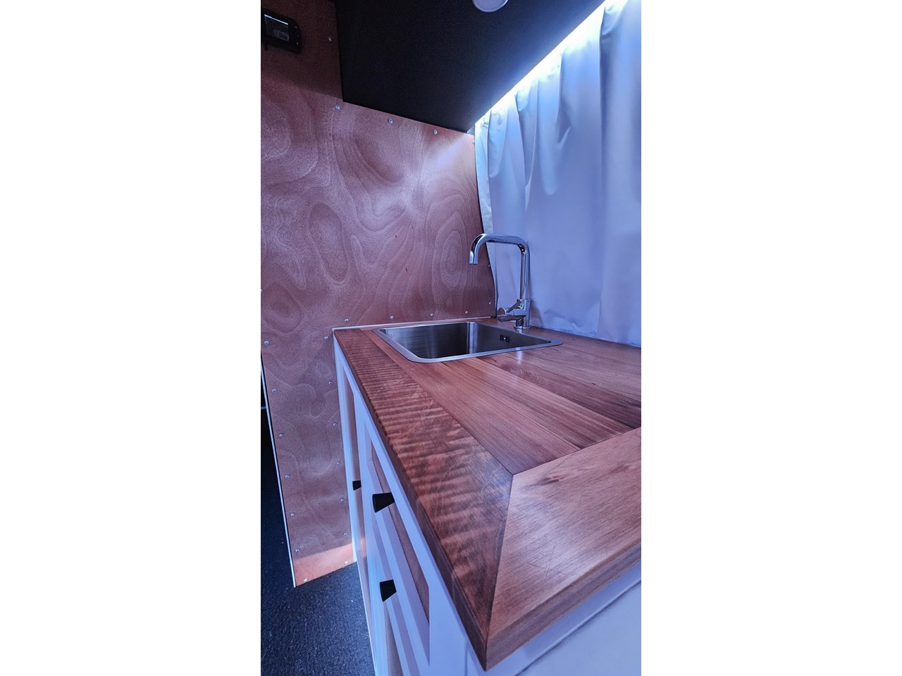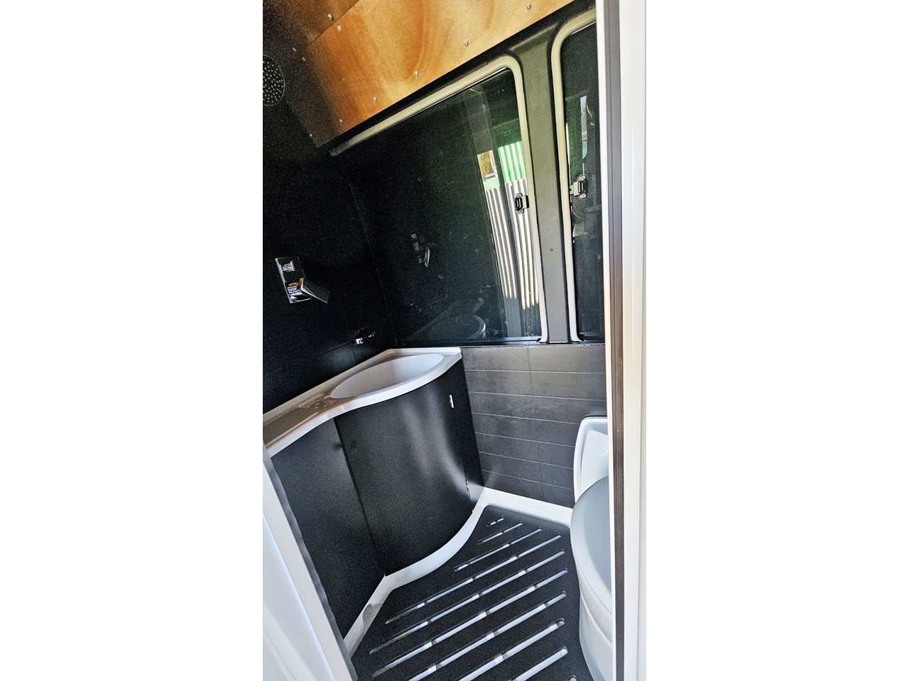 The wetroom is another work of art; all surfaces are sealed with 3 coats of epoxy sealer, then tanked with 3 coats of marine epoxy. The base is then coated with another 3 coats of epoxy brushing polyurethane, making the room completely waterproof and aesthetically stunning. All before the 4mm okoume ply tile board is cut and grooved, coated with 3 coats of shellac-based sealer on both sides, 3 coats of automotive lacquer, then finally fixed and sealed at all joins.