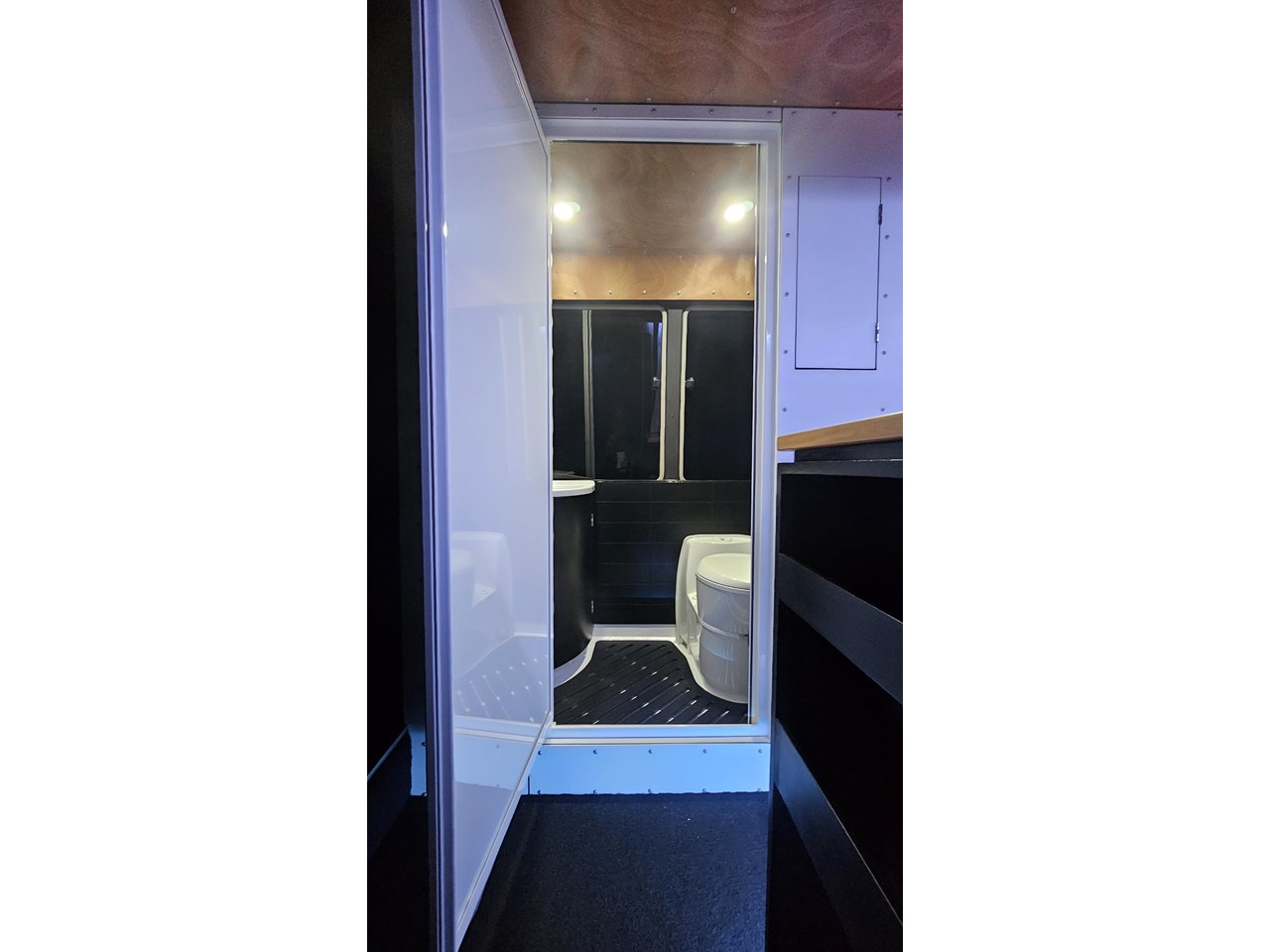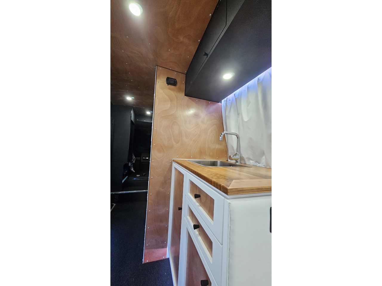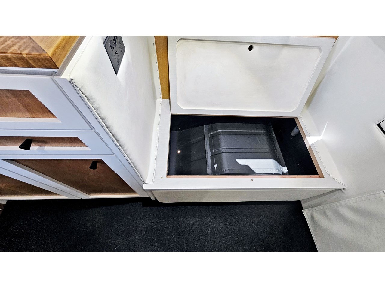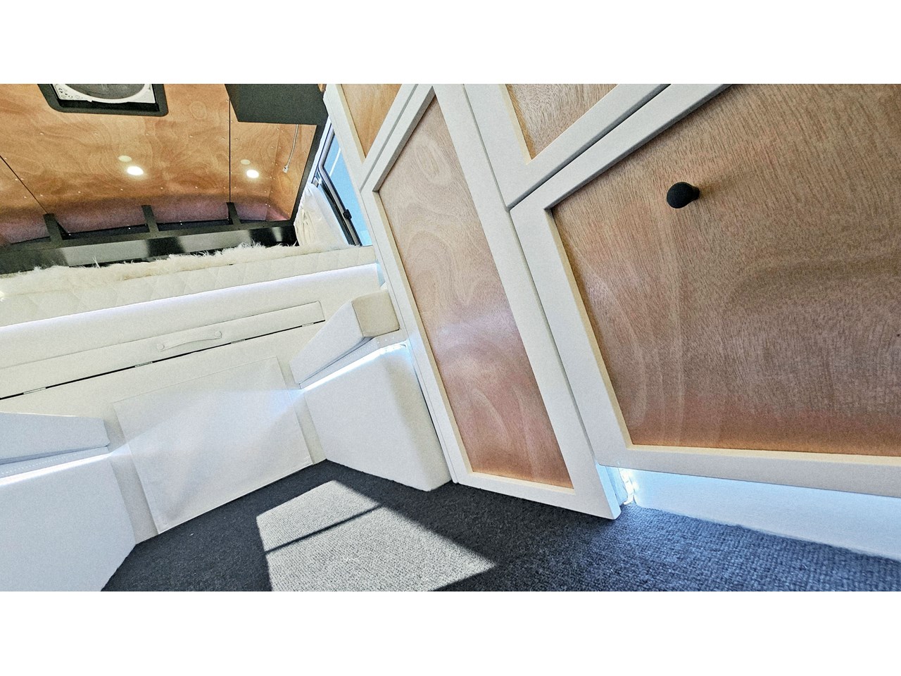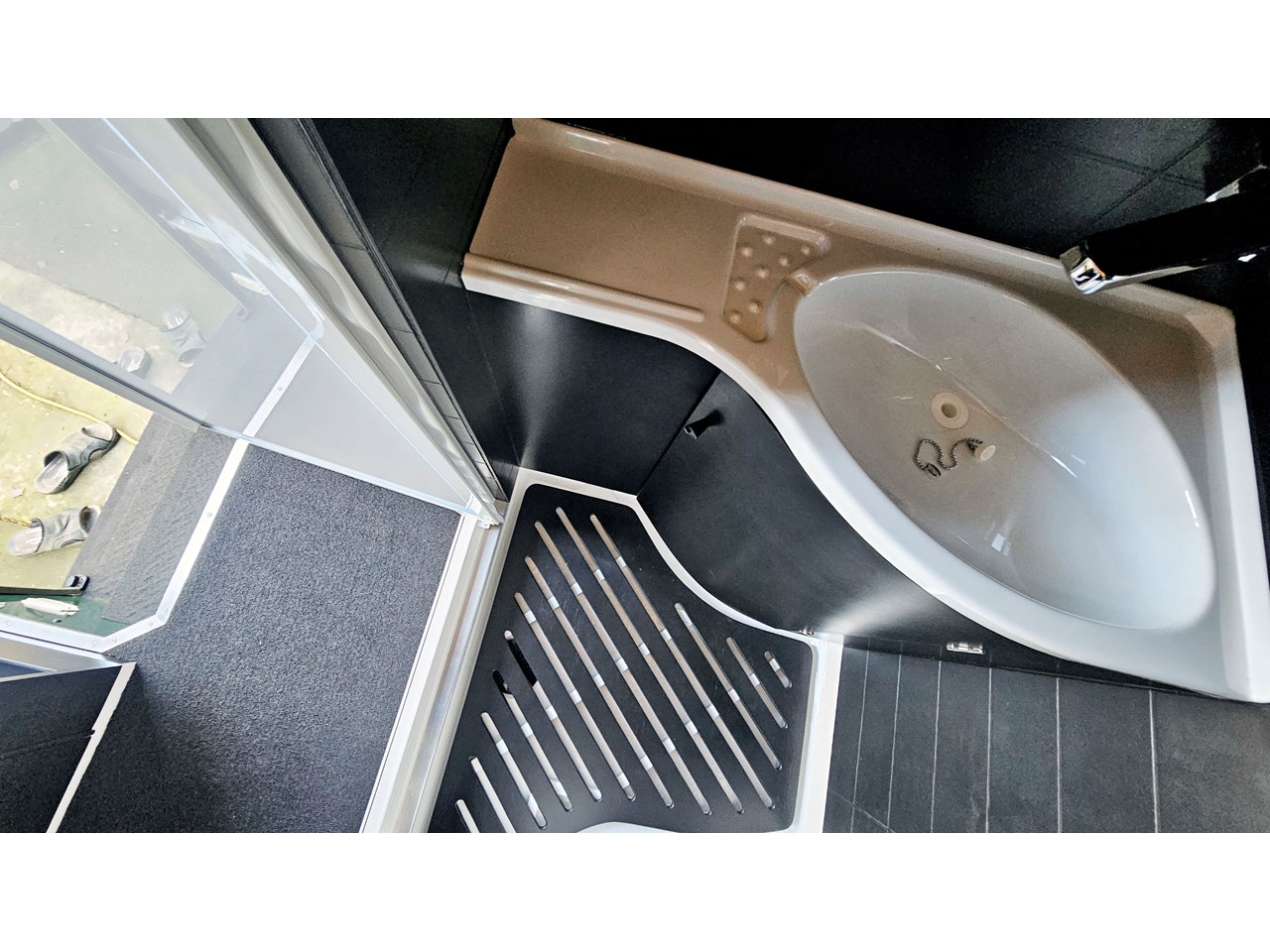 The wetroom is another work of art; all surfaces are sealed with 3 coats of epoxy sealer, then tanked with 3 coats of marine epoxy. The base is then coated with another 3 coats of epoxy brushing polyurethane, making the room completely waterproof and aesthetically stunning. All before the 4mm okoume ply tile board is cut and grooved, coated with 3 coats of shellac-based sealer on both sides, 3 coats of automotive lacquer, then finally fixed and sealed at all joins.
