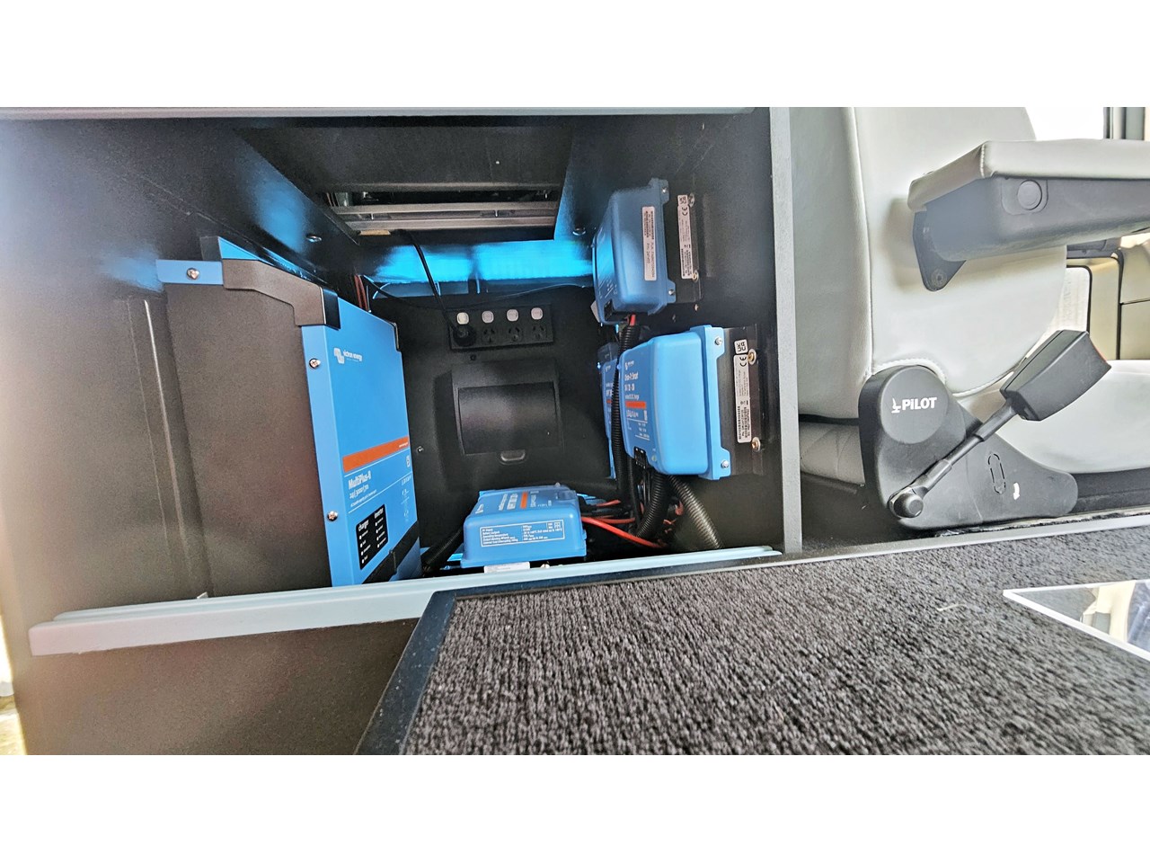 The electrical system is built exclusively with Victron components, providing 12v DC, 24v DC and 240v AC. All controlled and monitored with a Victron touch screen.