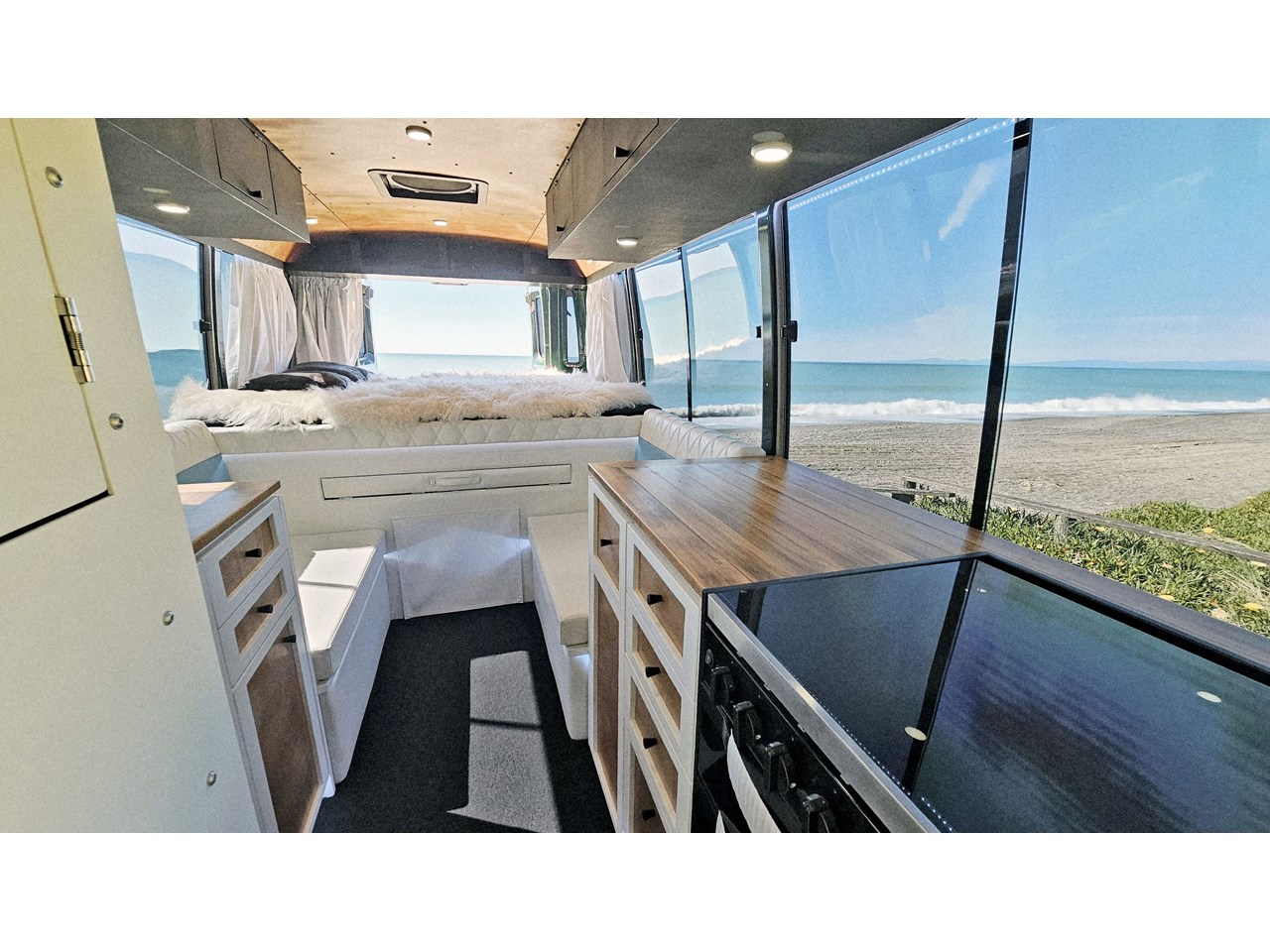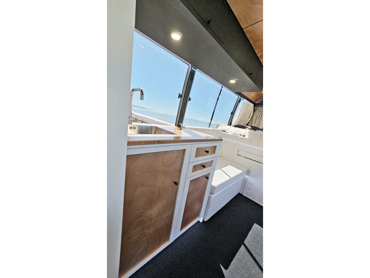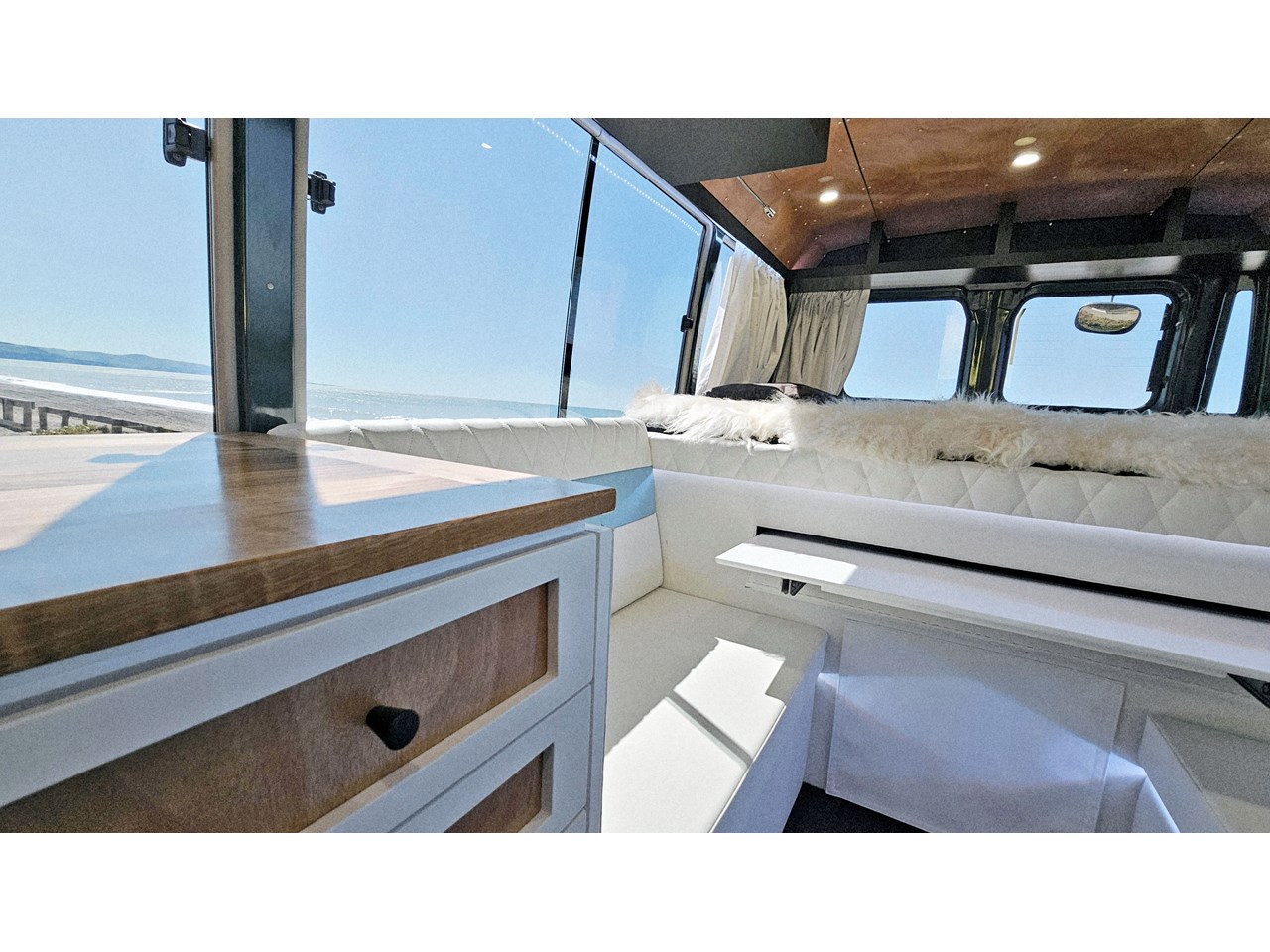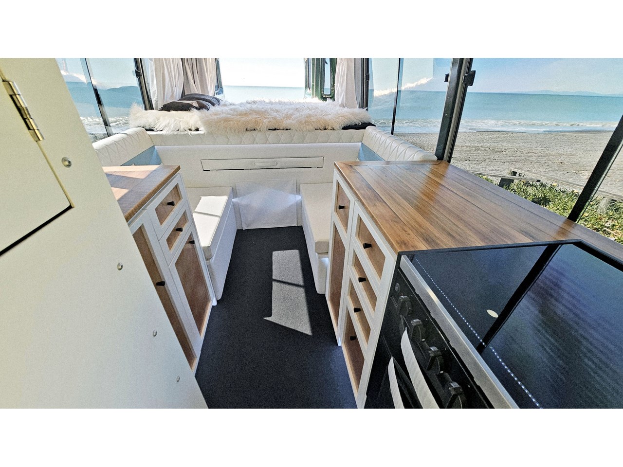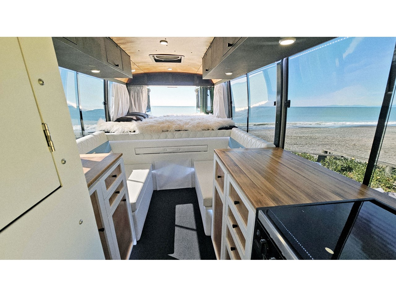 Enjoy all day views with windows all around while seated in Genuine Italian leather clad memory foam seating, bed, captains and passenger chairs, or watch the waves roll in at the side of the bed with rear barn doors.