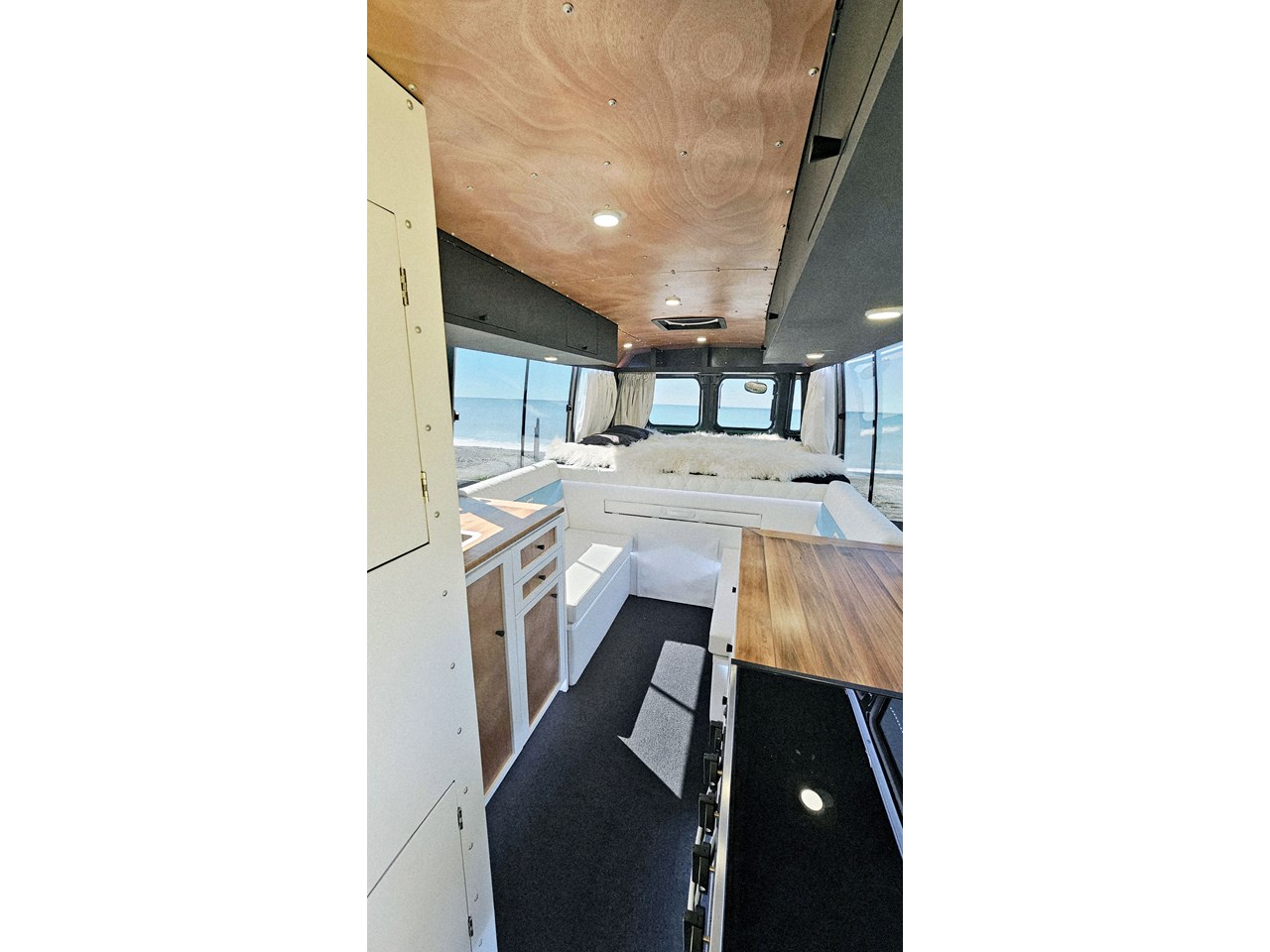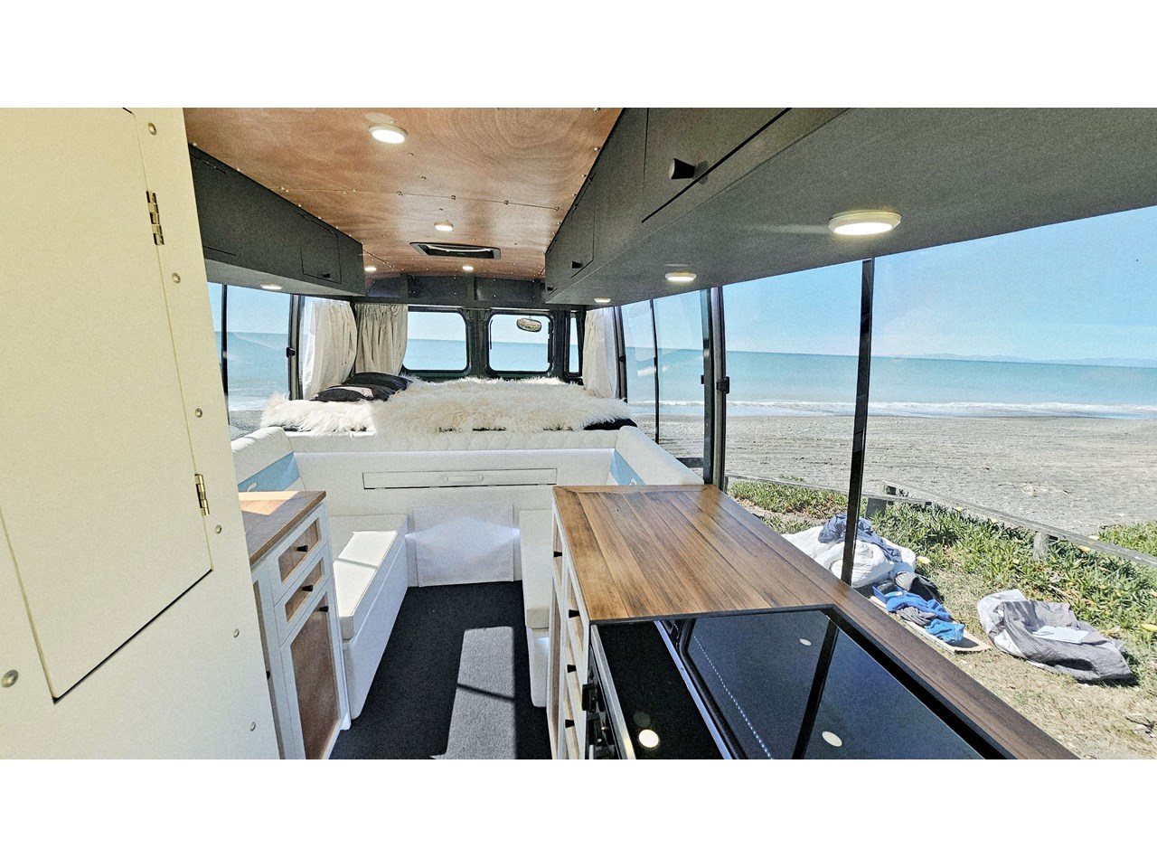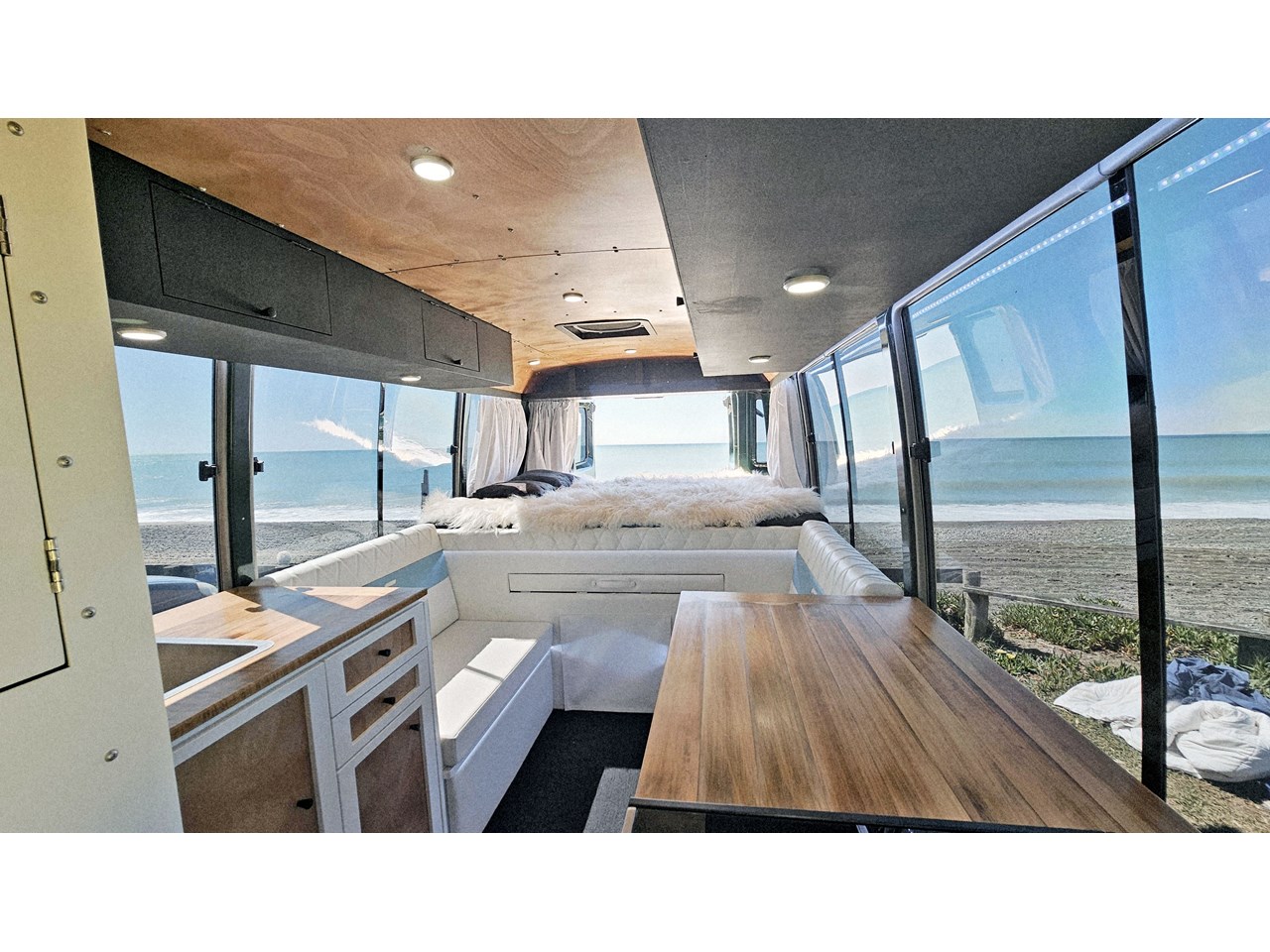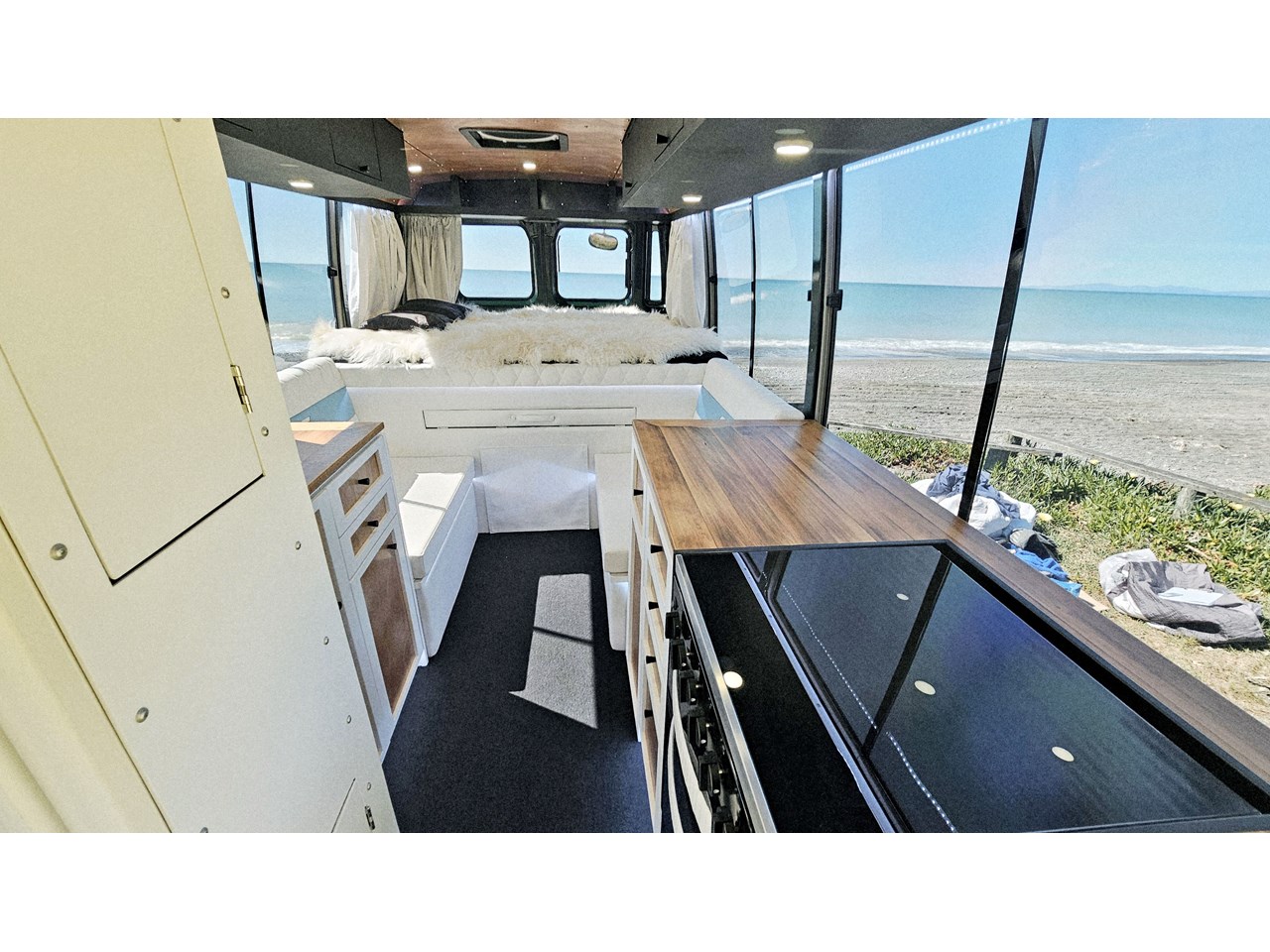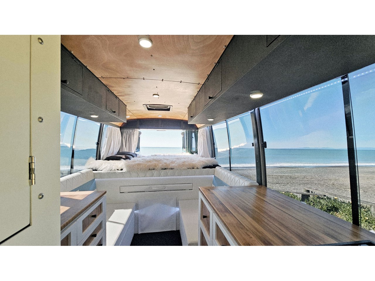 Enjoy all day views with windows all around while seated in Genuine Italian leather clad memory foam seating, bed, captains and passenger chairs, or watch the waves roll in at the side of the bed with rear barn doors.