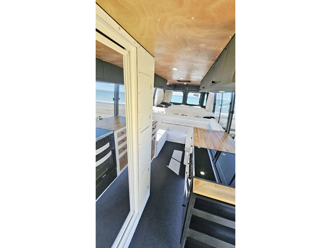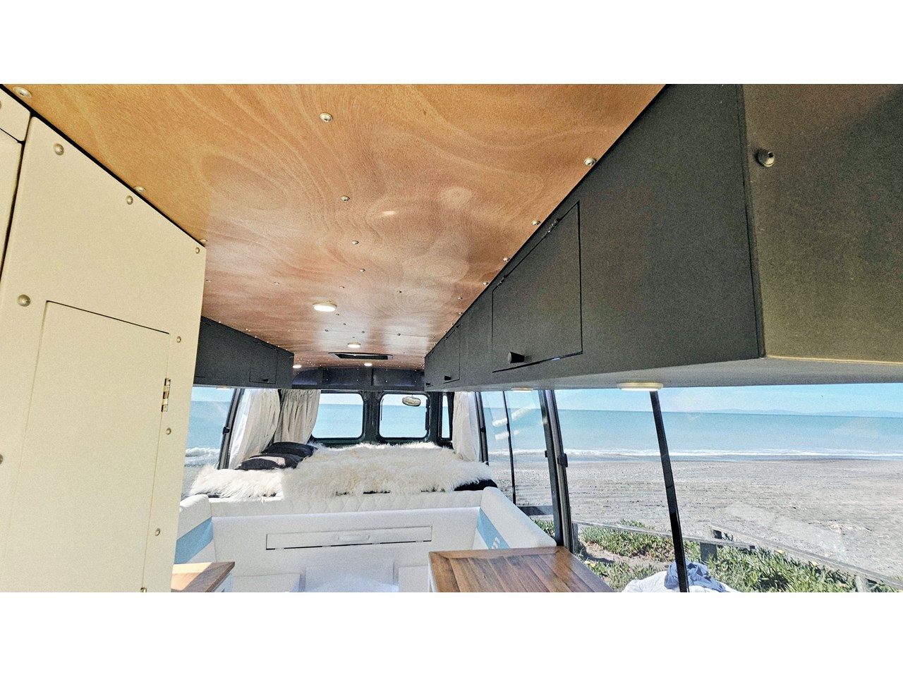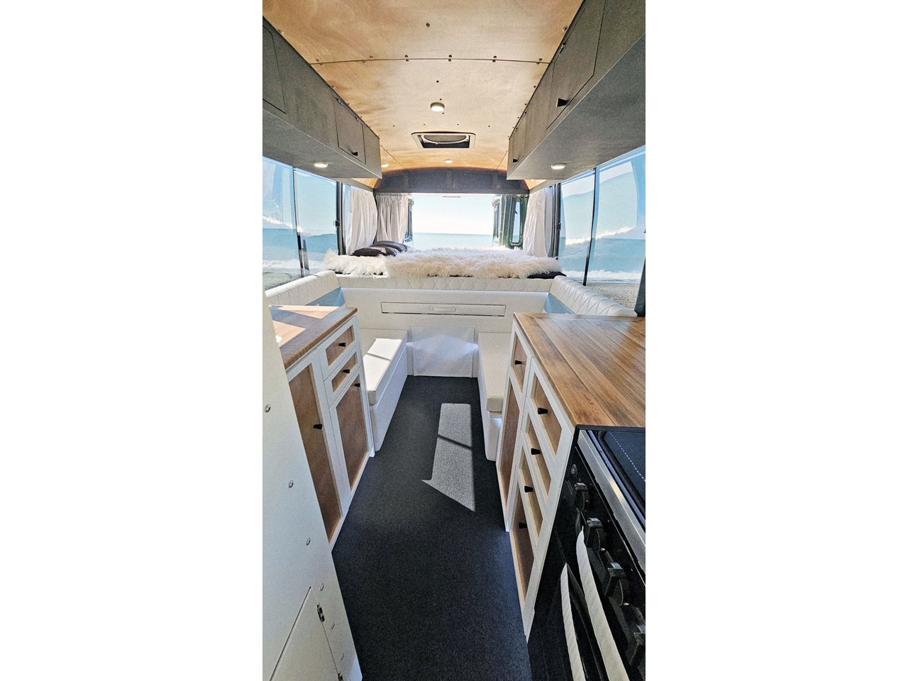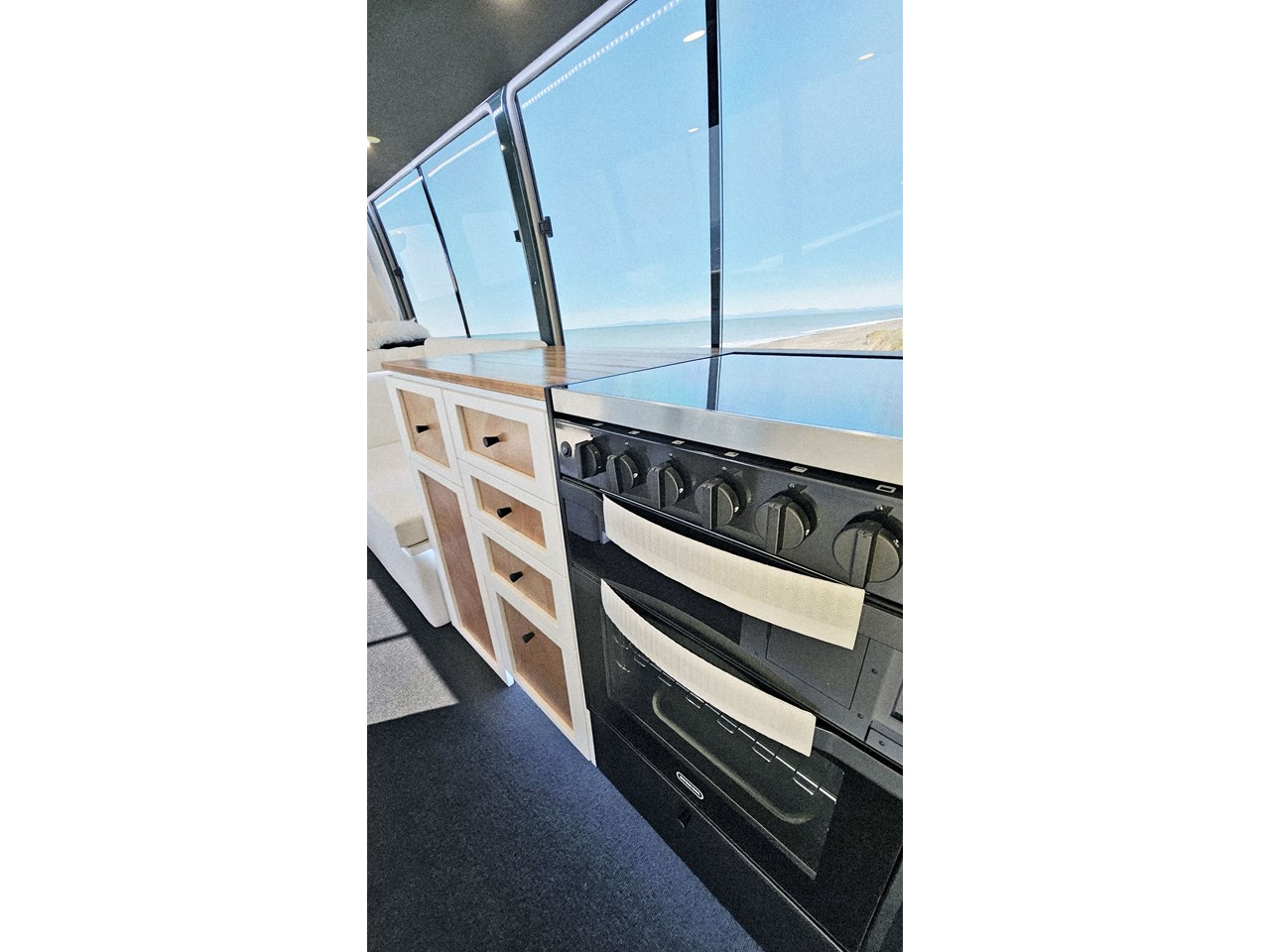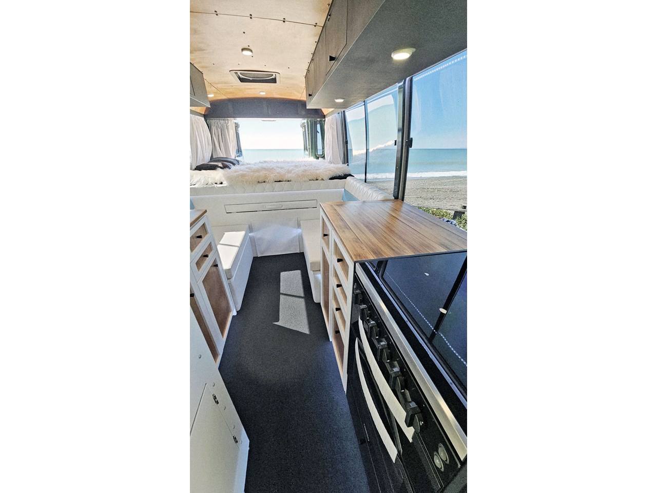 Enjoy all day views with windows all around while seated in Genuine Italian leather clad memory foam seating, bed, captains and passenger chairs, or watch the waves roll in at the side of the bed with rear barn doors.