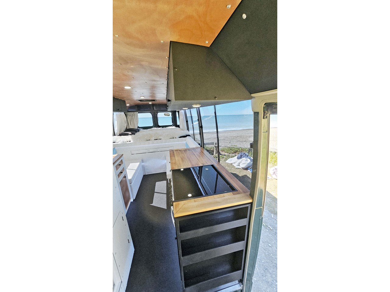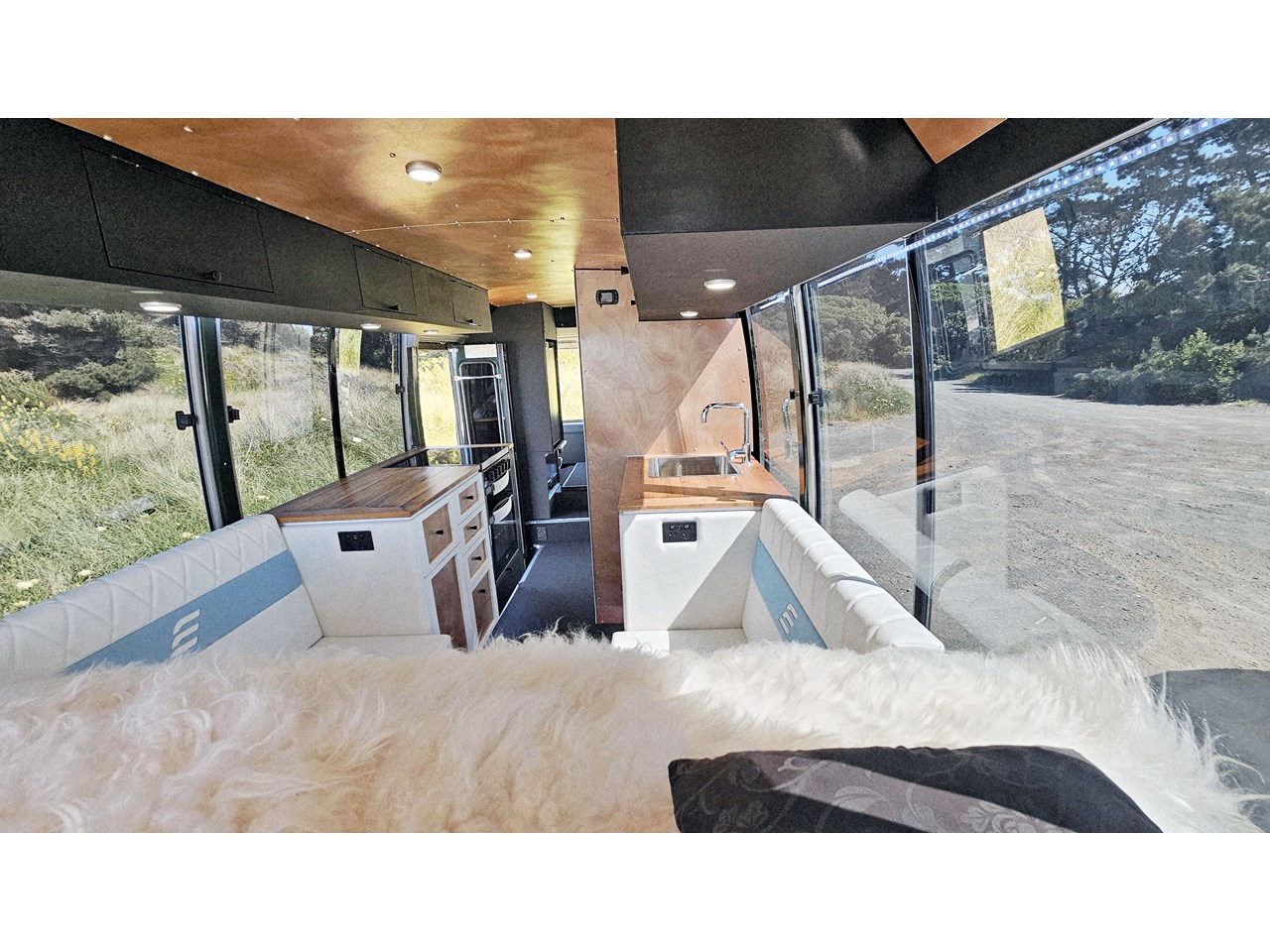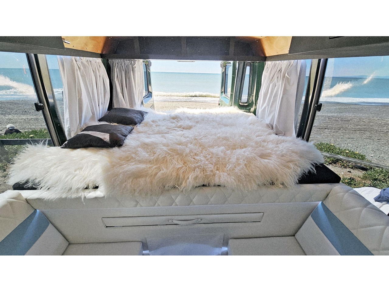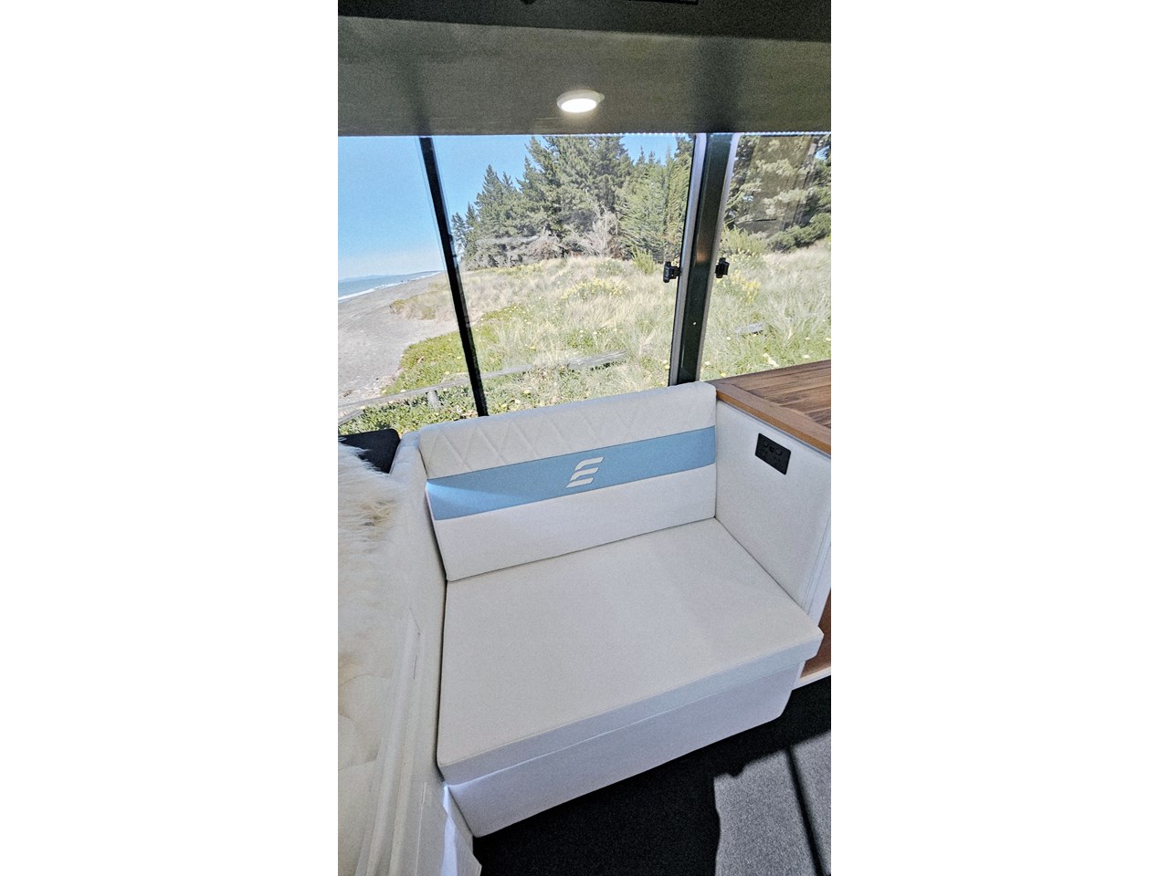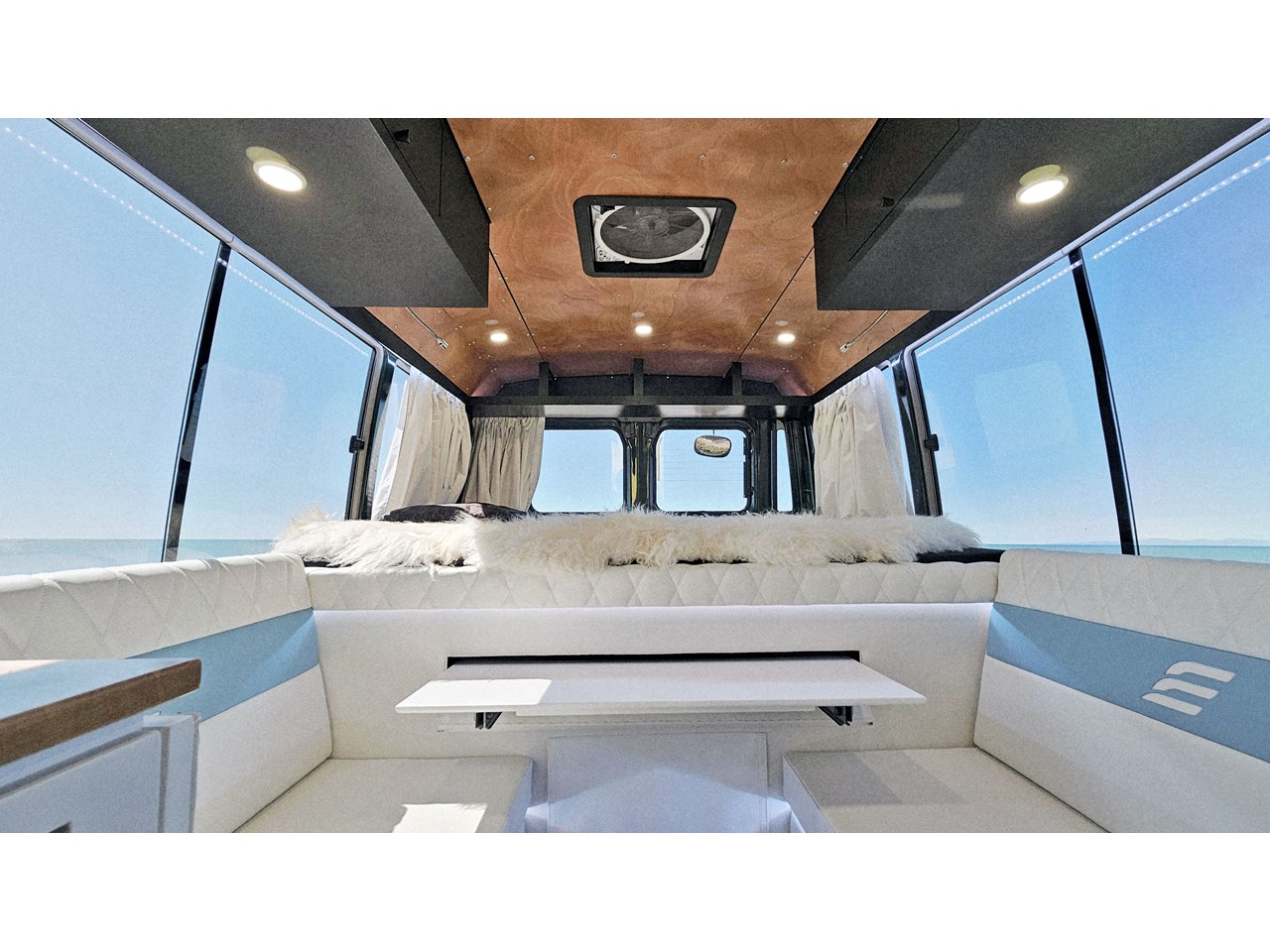 Enjoy all day views with windows all around while seated in Genuine Italian leather clad memory foam seating, bed, captains and passenger chairs, or watch the waves roll in at the side of the bed with rear barn doors.