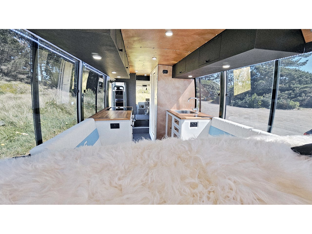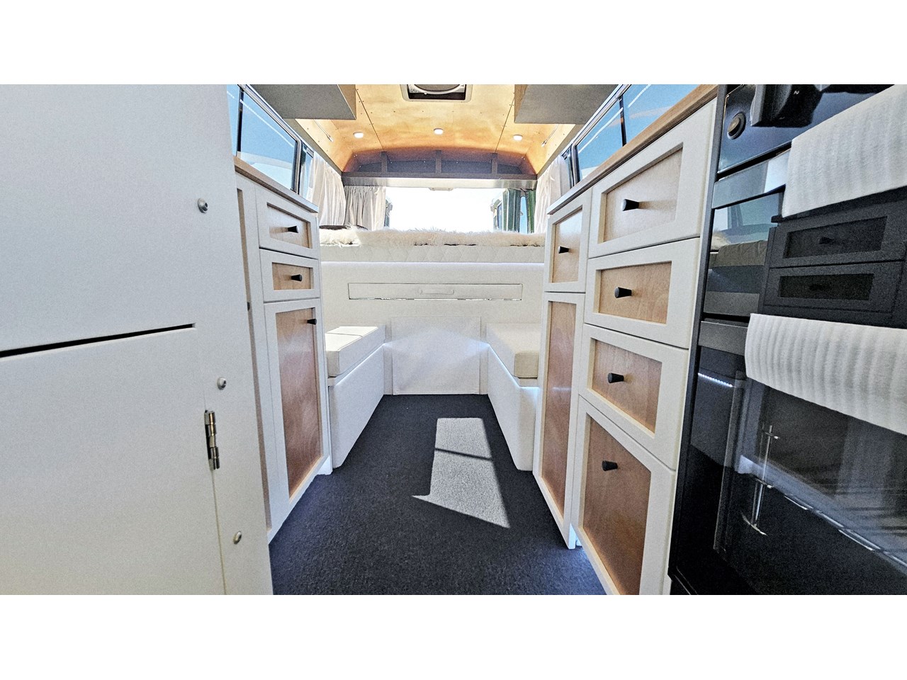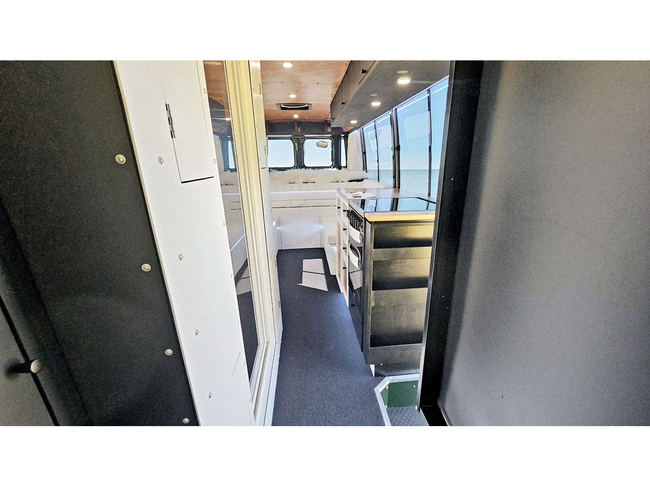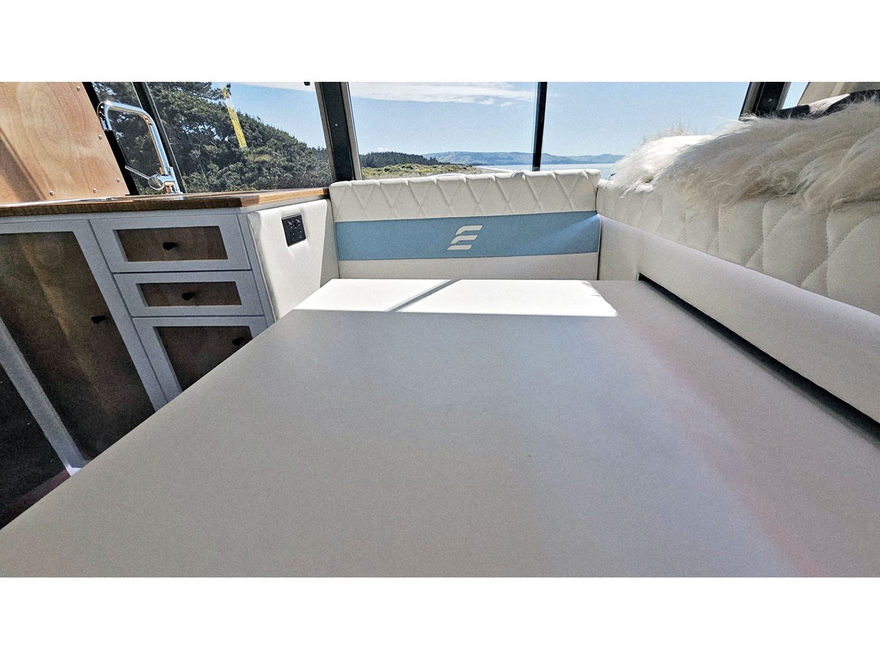 Enjoy all day views with windows all around while seated in Genuine Italian leather clad memory foam seating, bed, captains and passenger chairs, or watch the waves roll in at the side of the bed with rear barn doors.