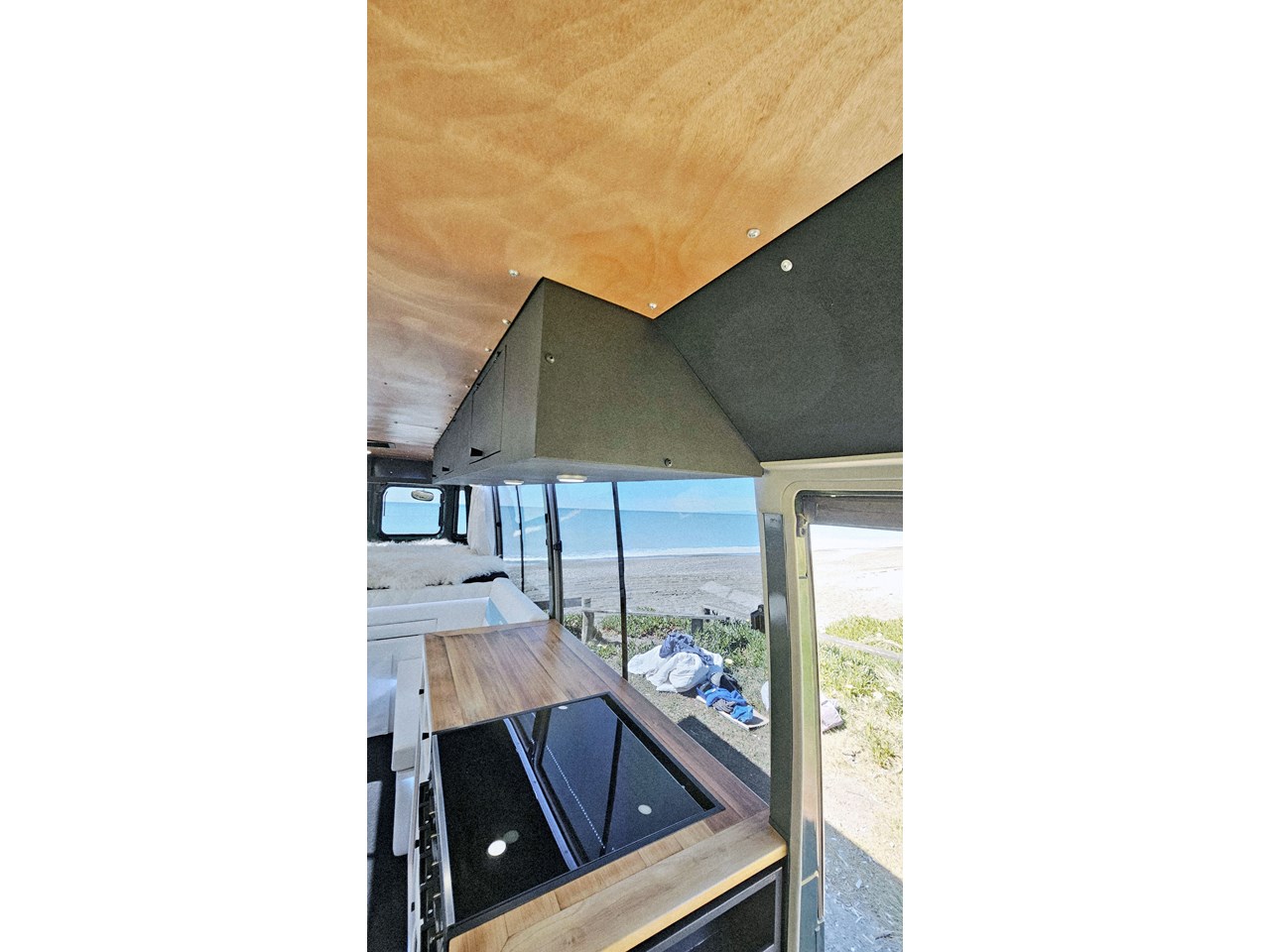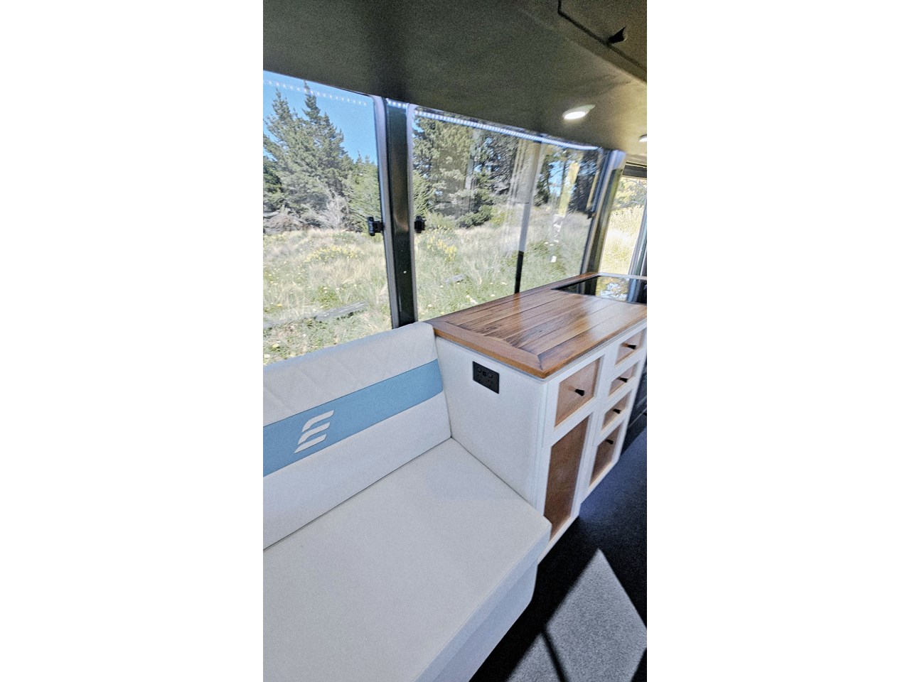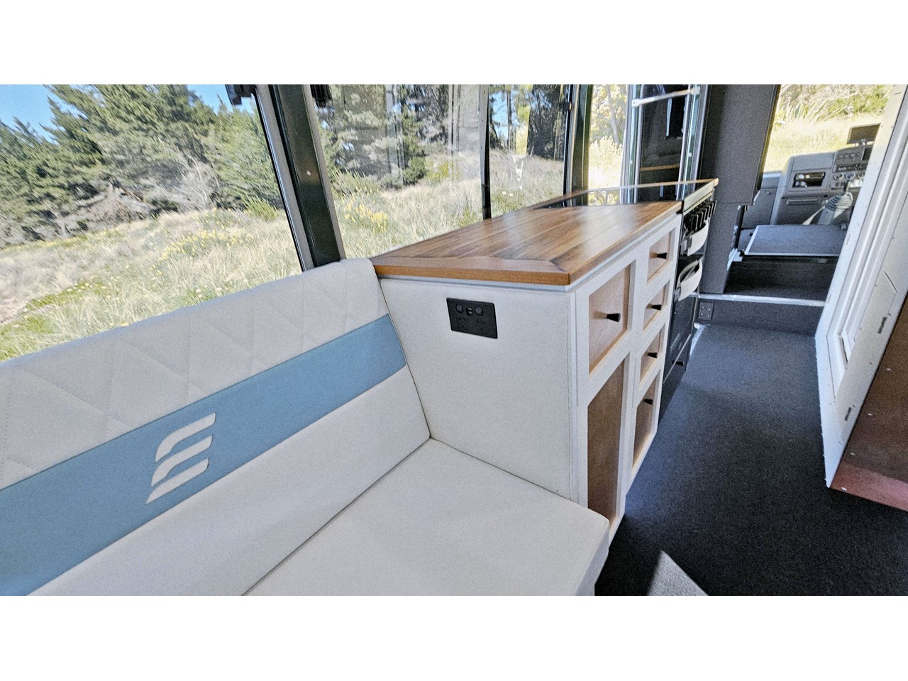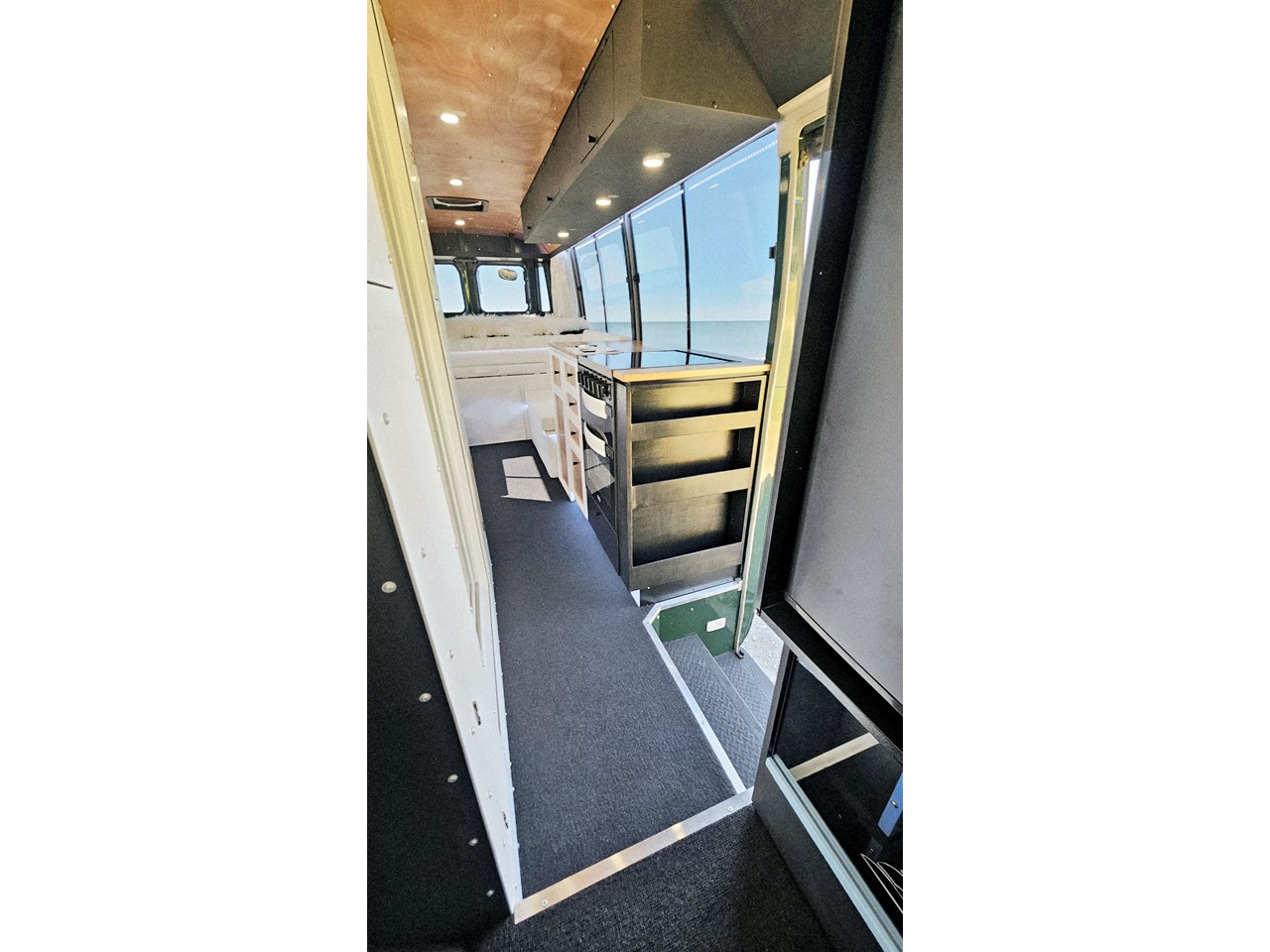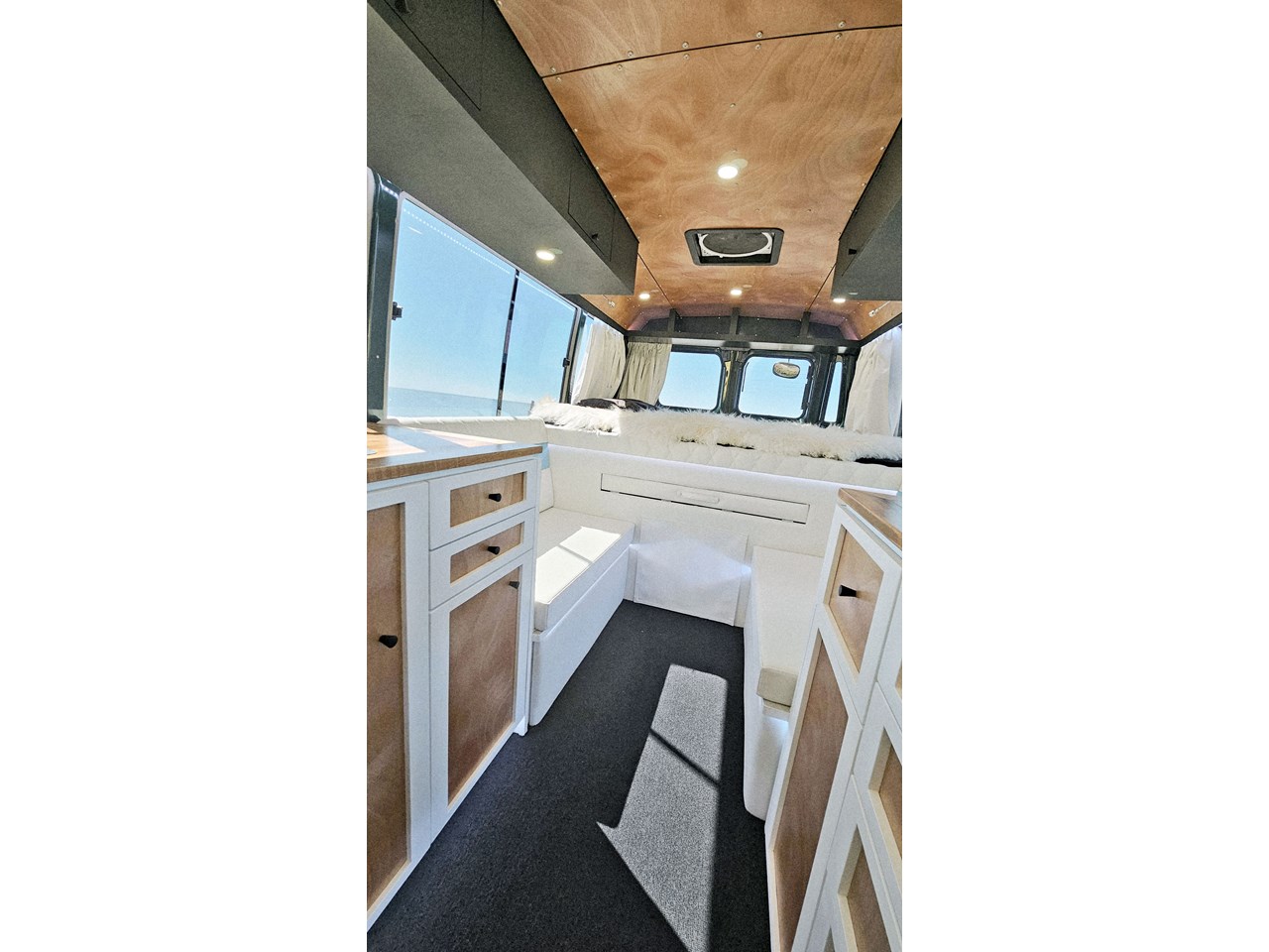 Enjoy all day views with windows all around while seated in Genuine Italian leather clad memory foam seating, bed, captains and passenger chairs, or watch the waves roll in at the side of the bed with rear barn doors.
