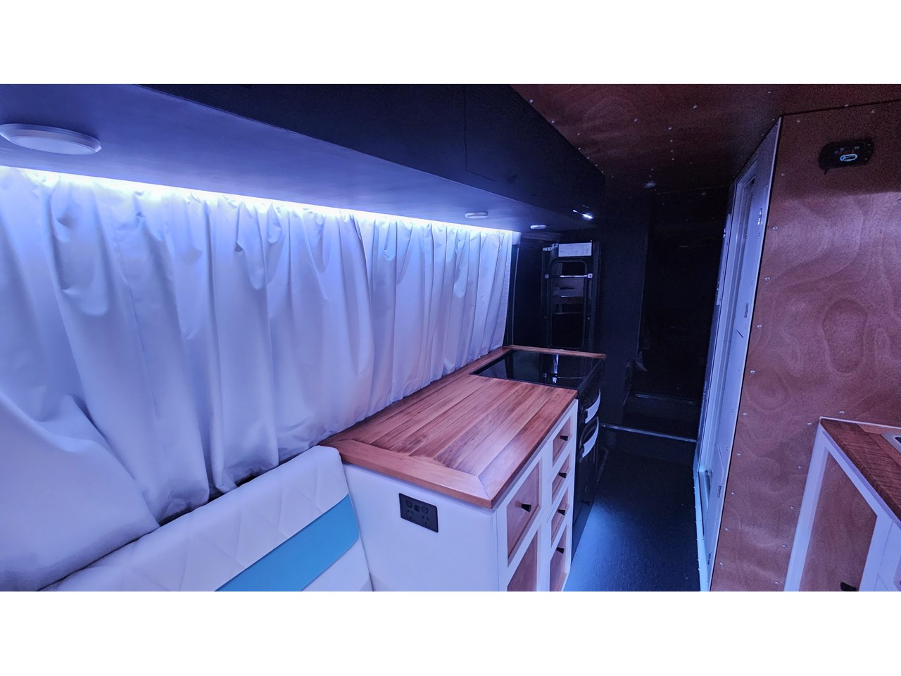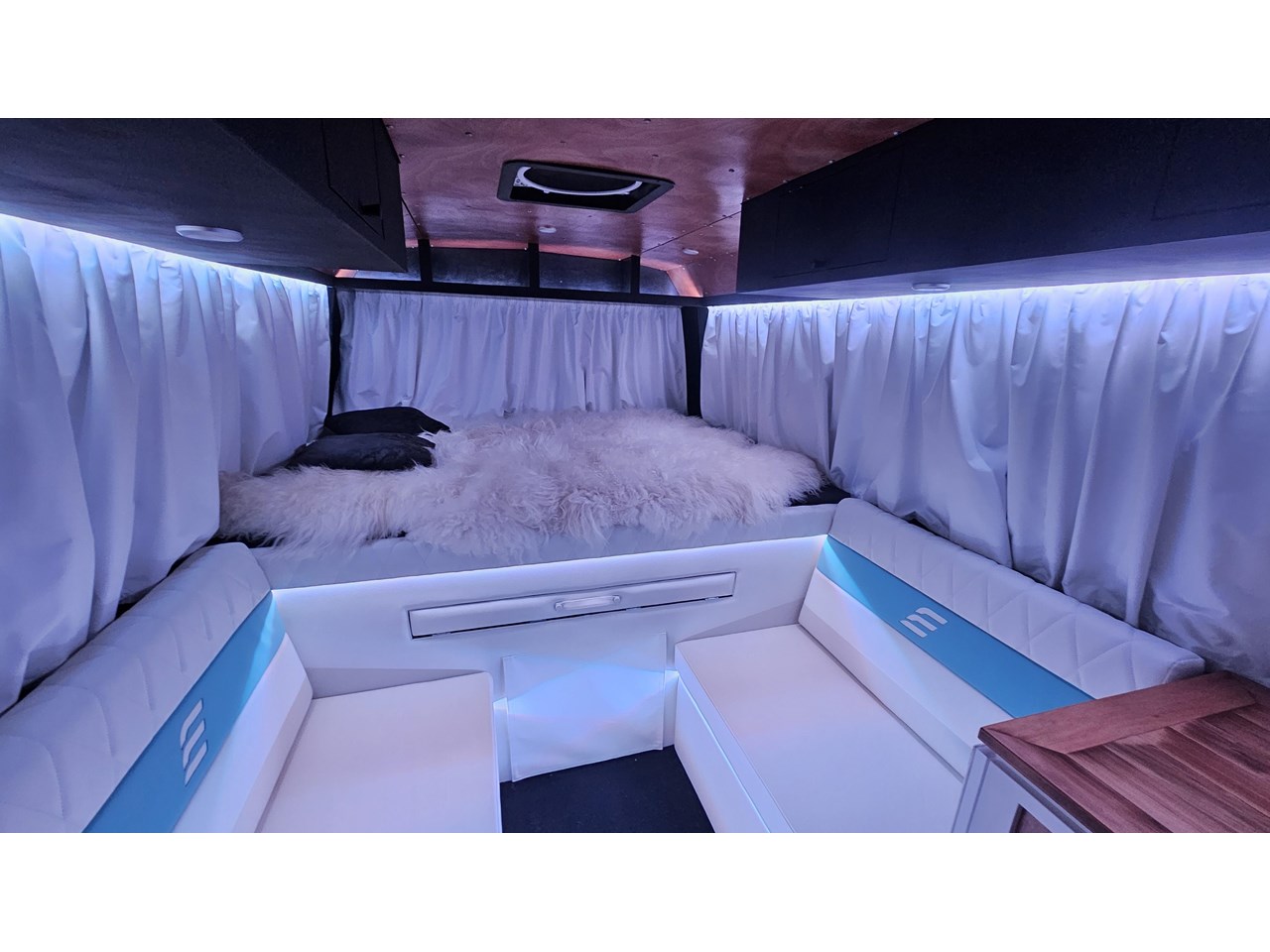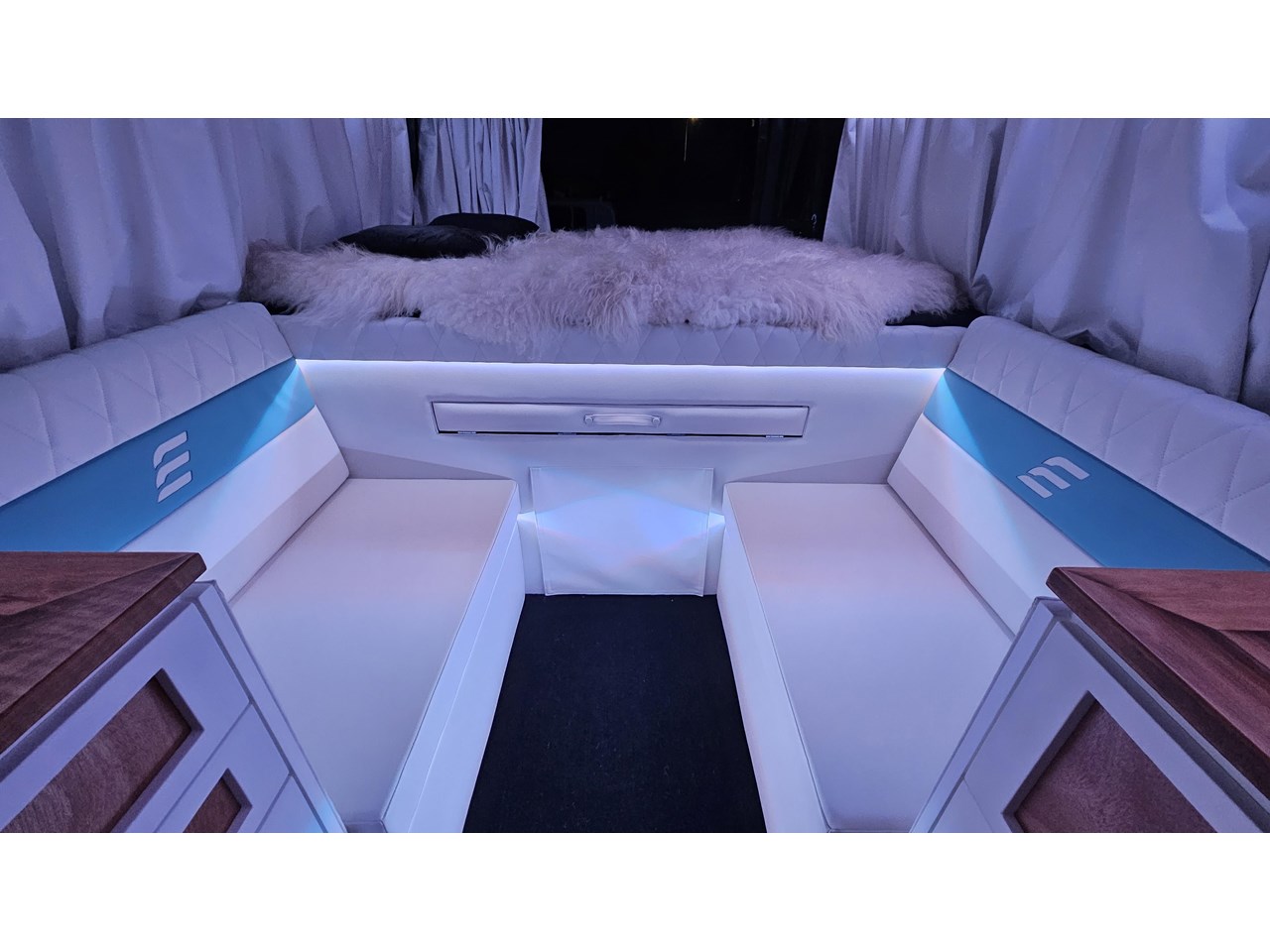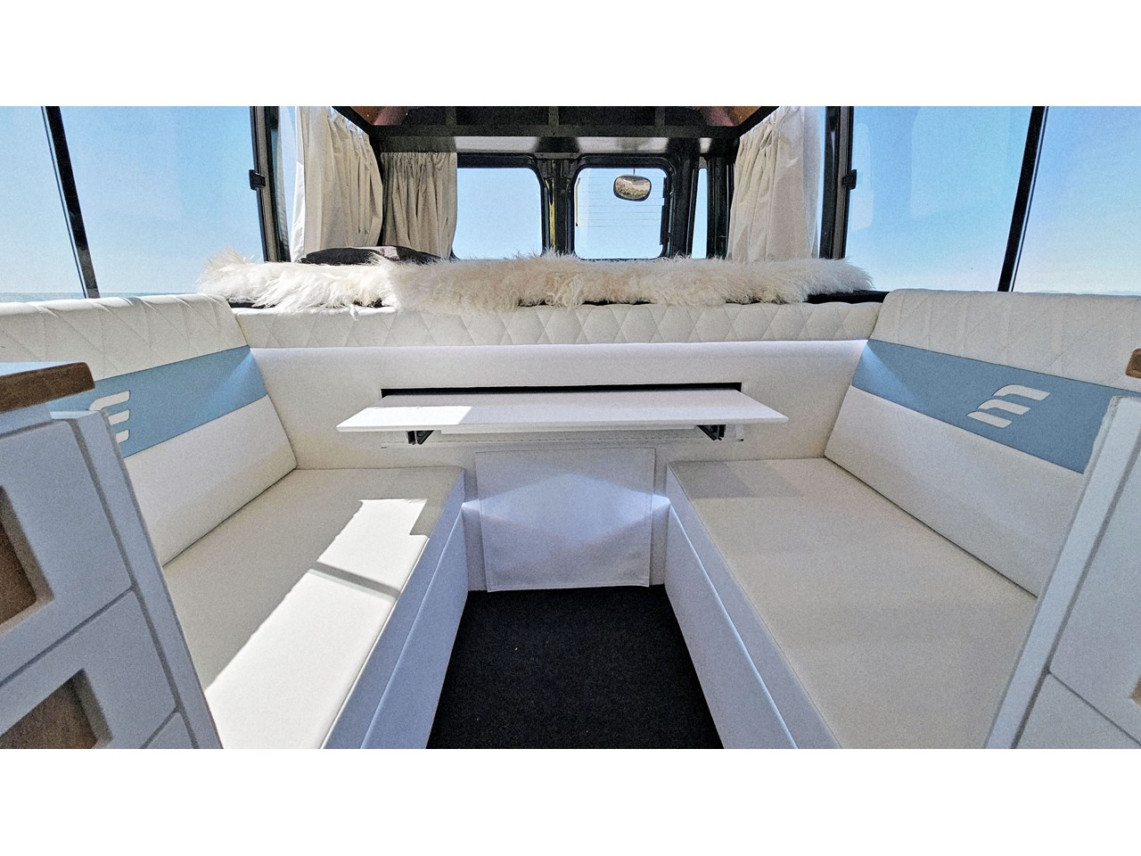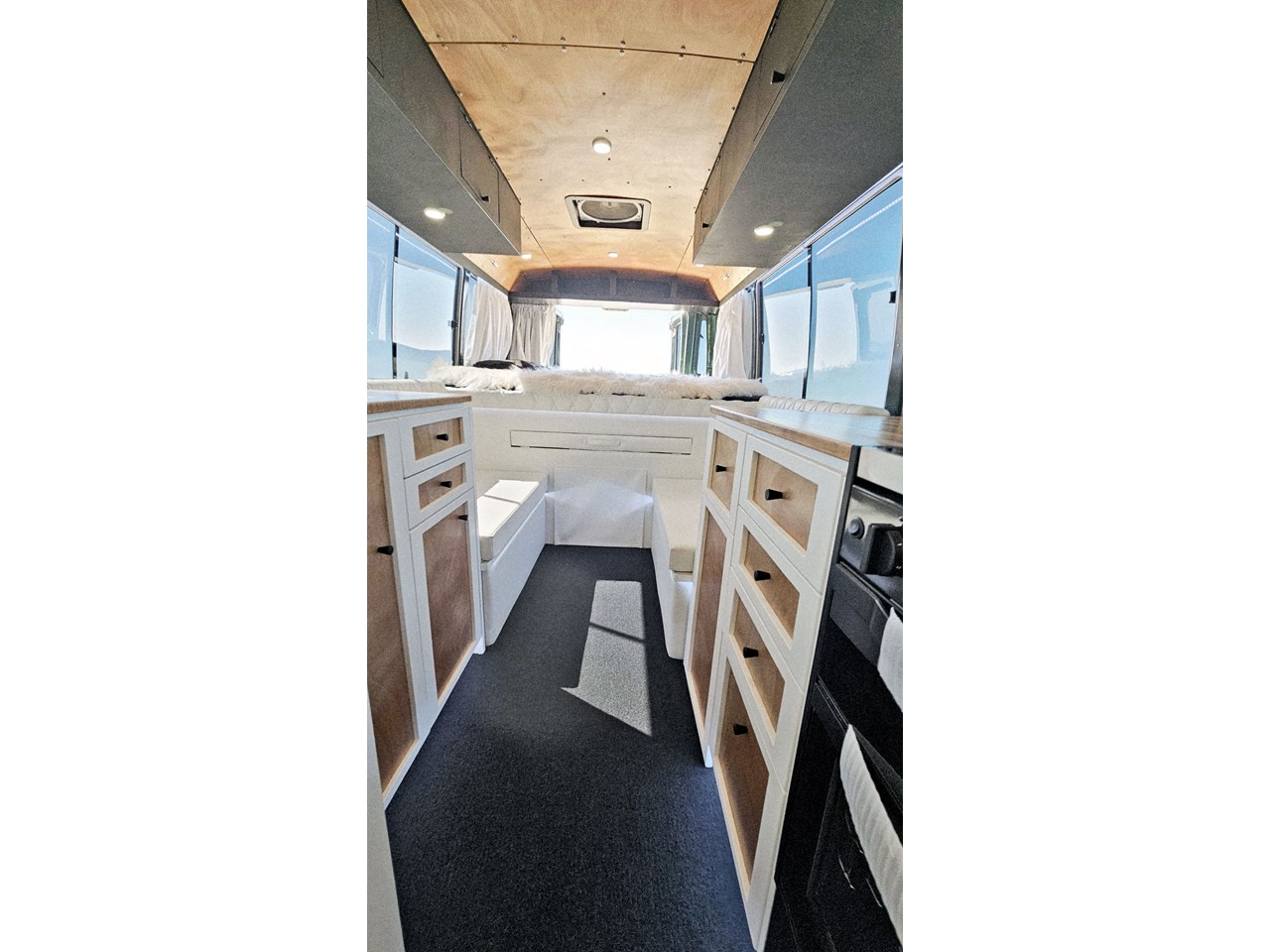 Enjoy all day views with windows all around while seated in Genuine Italian leather clad memory foam seating, bed, captains and passenger chairs, or watch the waves roll in at the side of the bed with rear barn doors.
