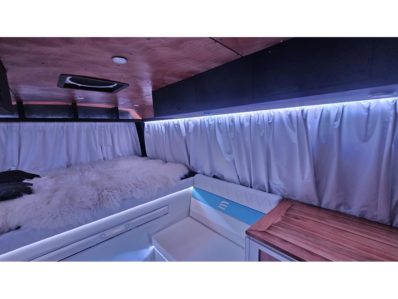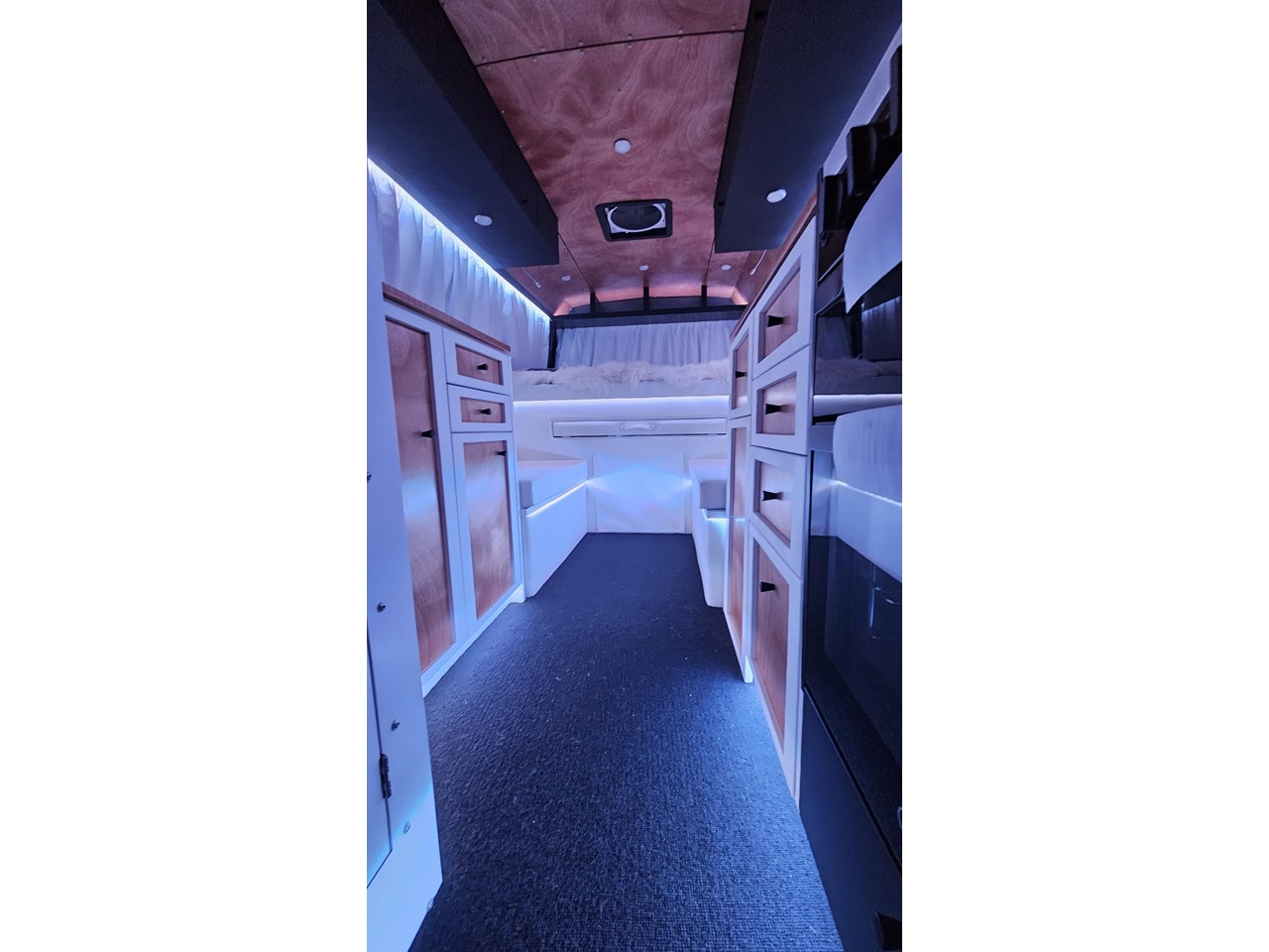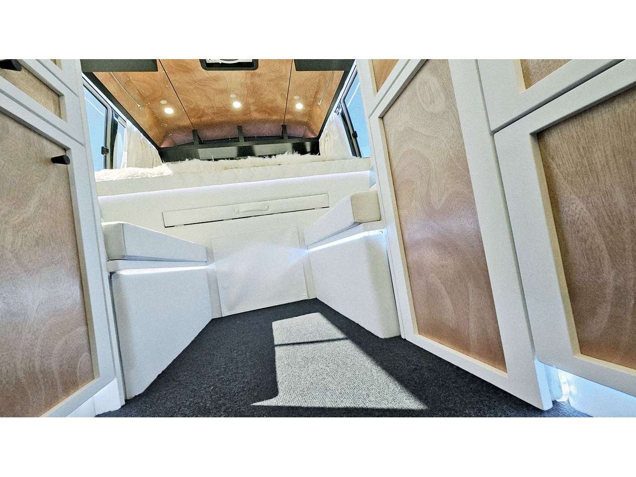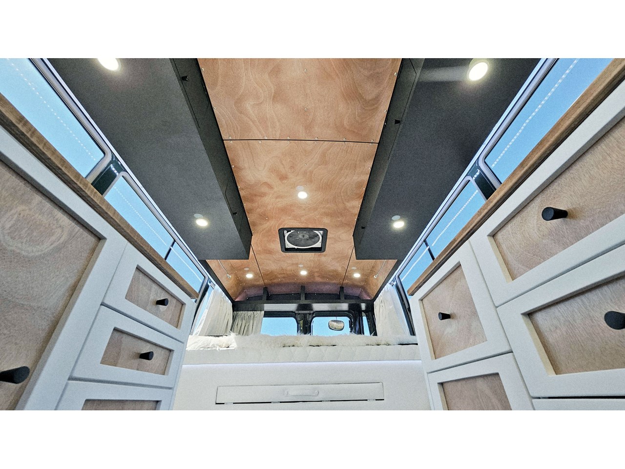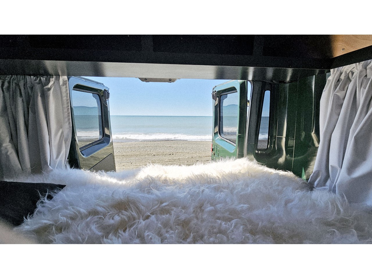 Enjoy all day views with windows all around while seated in Genuine Italian leather clad memory foam seating, bed, captains and passenger chairs, or watch the waves roll in at the side of the bed with rear barn doors.