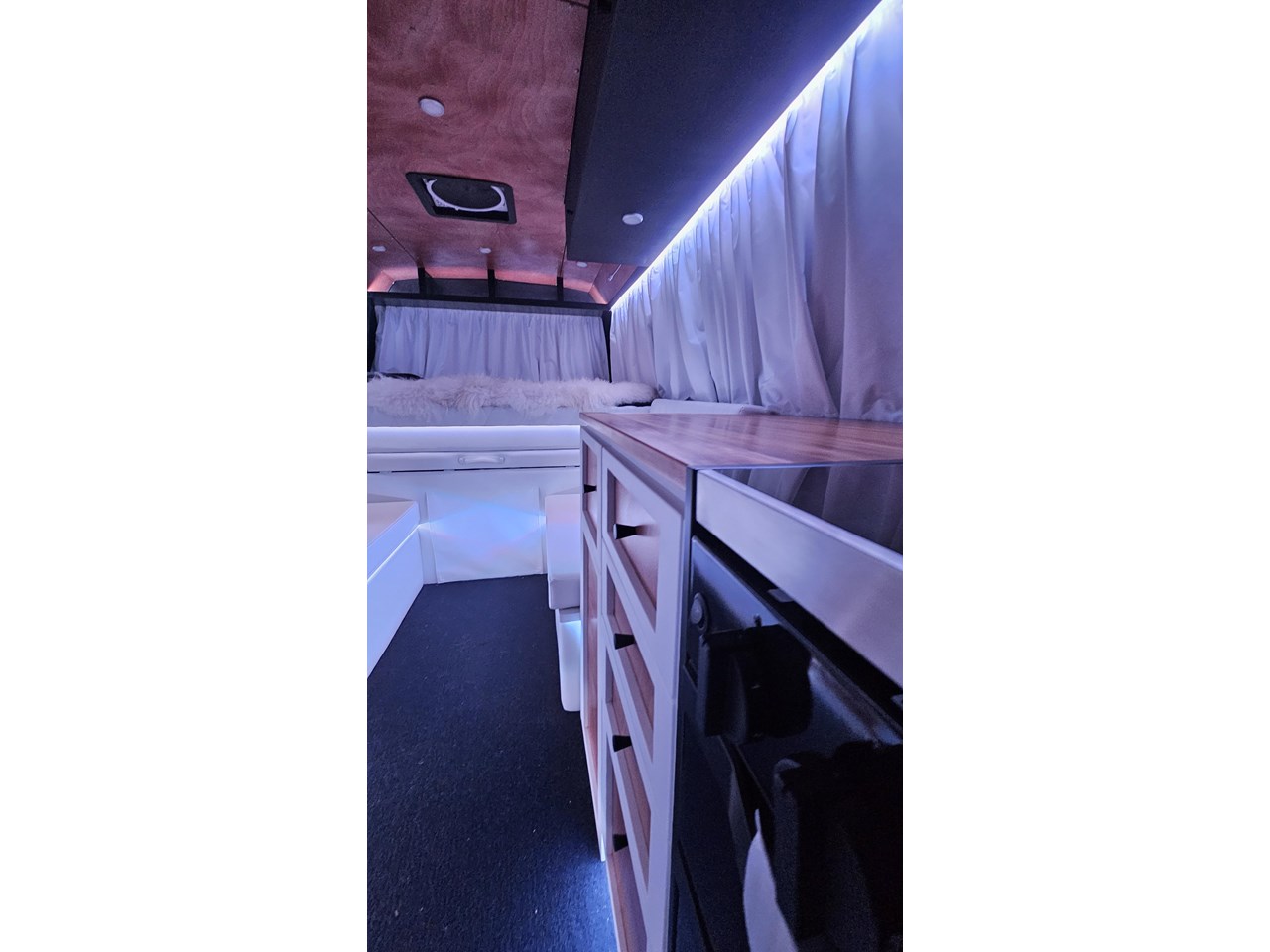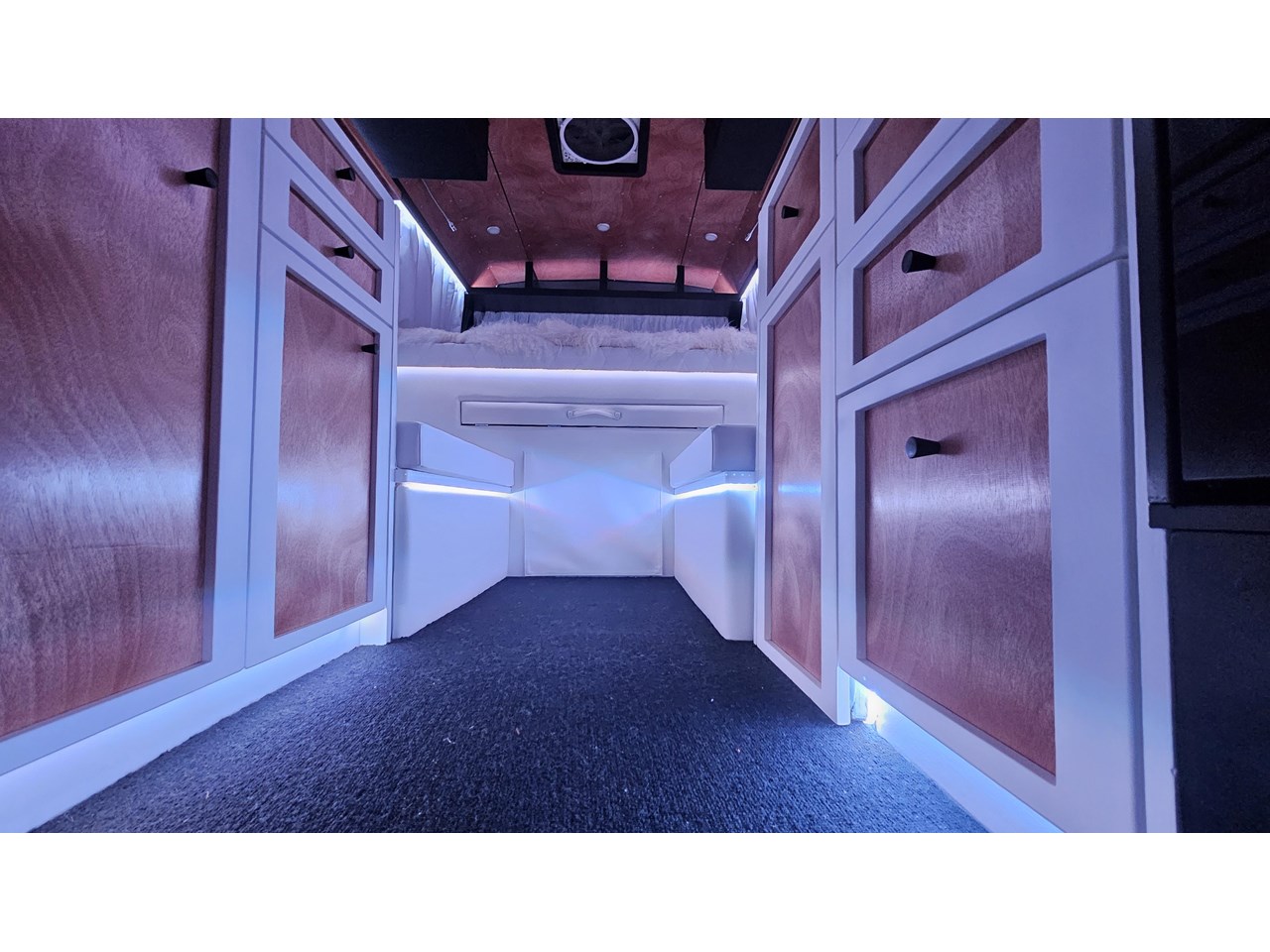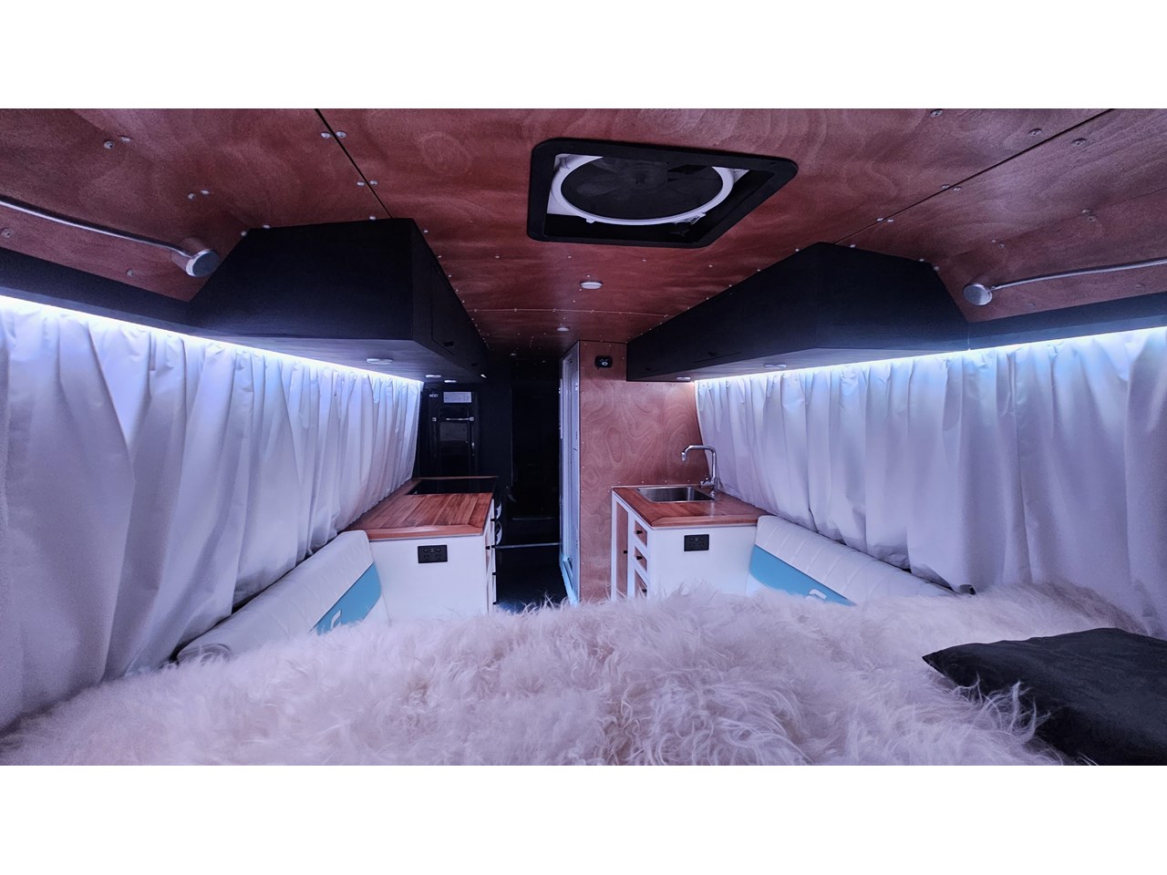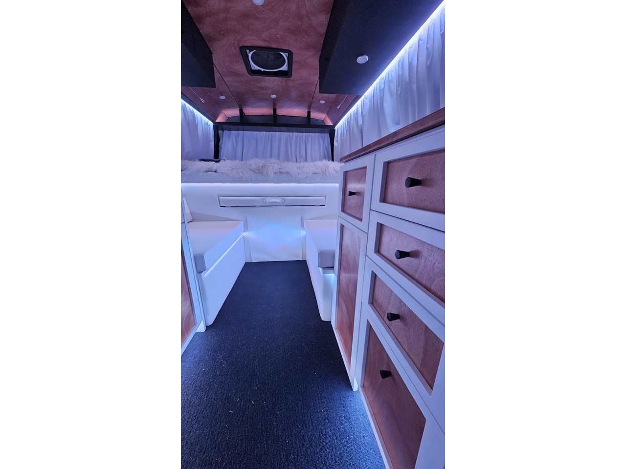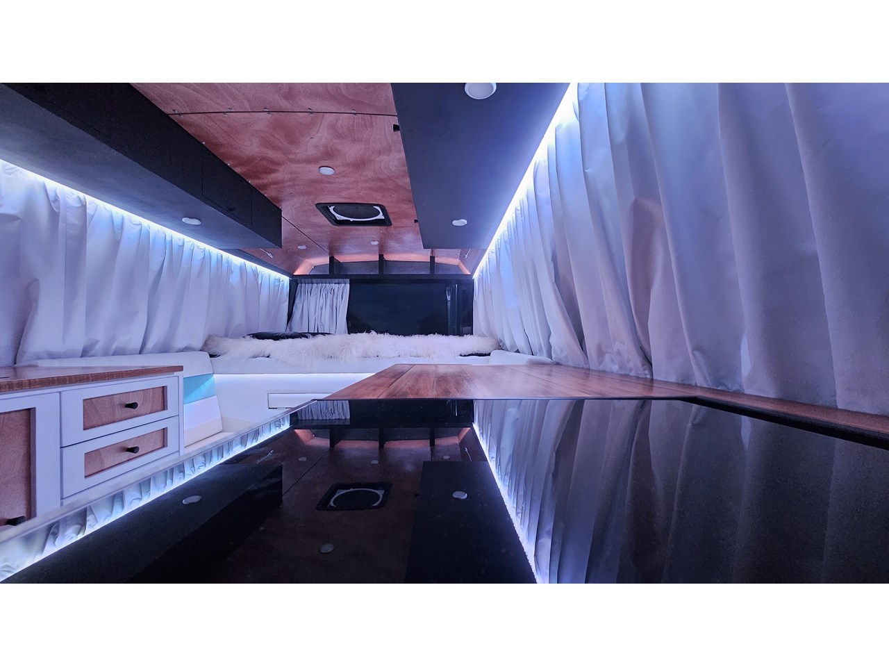 Enjoy all day views with windows all around while seated in Genuine Italian leather clad memory foam seating, bed, captains and passenger chairs, or watch the waves roll in at the side of the bed with rear barn doors.