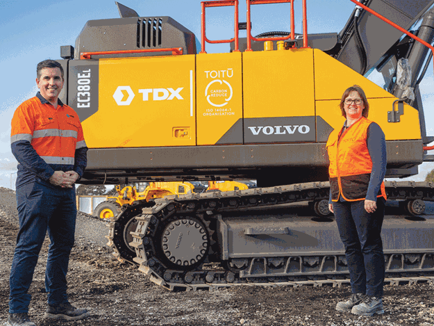 TDX CEO Colm Hamrogue with Belinda Mathers, chief science and advisory officer of Toitū Envirocare, alongside a Volvo EC380EL hybrid excavator